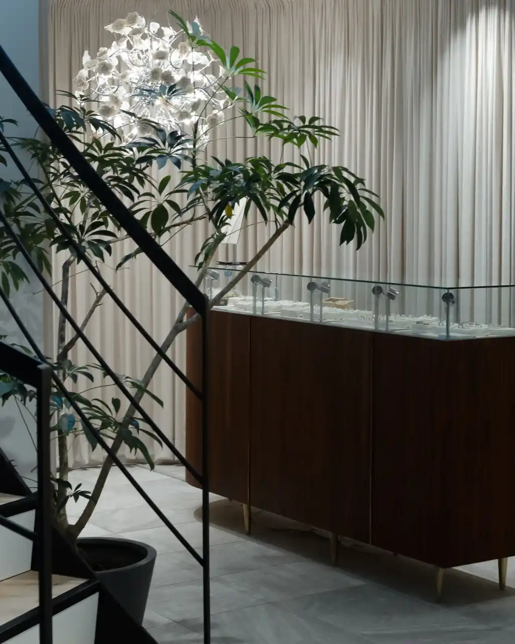 e.m.の旗艦店である【e.m. 青山店】のB1Fに併設されたブライダルサロン。 広々とした空間でブライダルリング・ブライダルアイテムを ゆっくりご覧いただけます。 |