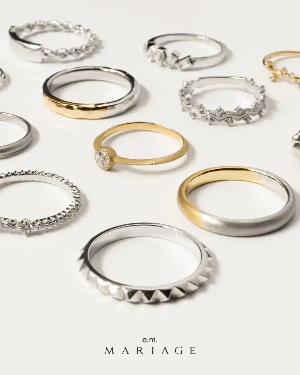 ジュエリーブランド【e.m.】のブライダルラインとして、“しあわせさがしのモノづくり”をコンセプトにブライダルジュエリーを展開しています。 ファッションジュエリー同様オリジナリティ溢れるデザインや、おふたりのお好みのデザインをカタチにするセレクトオーダー・セミオーダーも取りそろえます。