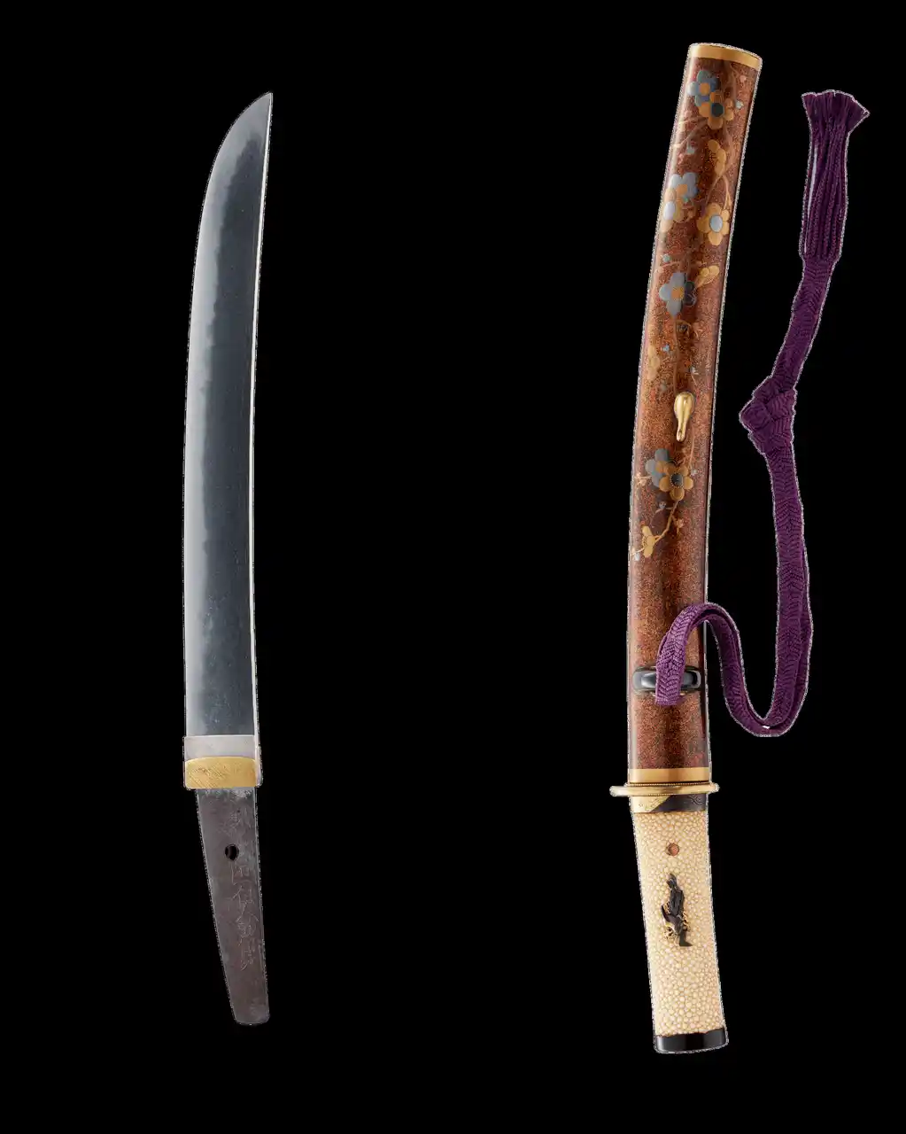 短刀 越前国住人兼則(江戸時代初期) 金梨子地梅樹蒔絵鞘小サ刀拵付/大阪刀剣会 吉井 |