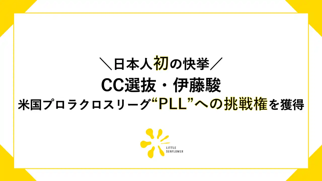 | 株式会社Little Sunflower(東京都中央区)主催の日本最大級のラクロス国際マッチ「KPMG SEKAI CROSSE 2026」に出場したゴーリー(ゴールキーパー)・伊藤駿選手が、アメリカのプロラクロスリーグ「Premier Lacrosse League(PLL)」のトレーニングキャンプへ参加することが決定いたしました。トレーニングキャンプの参加を通じて評価をされれば、正式契約につながる可能性が大いにあります。なお、日本人選手がPLLのこうした機会を得るのは、史上初の快挙となります。 | ||||||||||||||||||||||||||