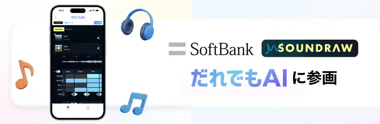SOUNDRAW株式会社(本社:東京都渋谷区、代表取締役:楠 太吾 以下SOUNDRAW)は、ソフトバンク株式会社(本社:東京都港区、以下ソフトバンク)が2026年4月17日より提供を開始する「だれでも AI」に参画し、著作権フリーのAI音楽生成・作曲ツールの提供を開始いたします。 |
