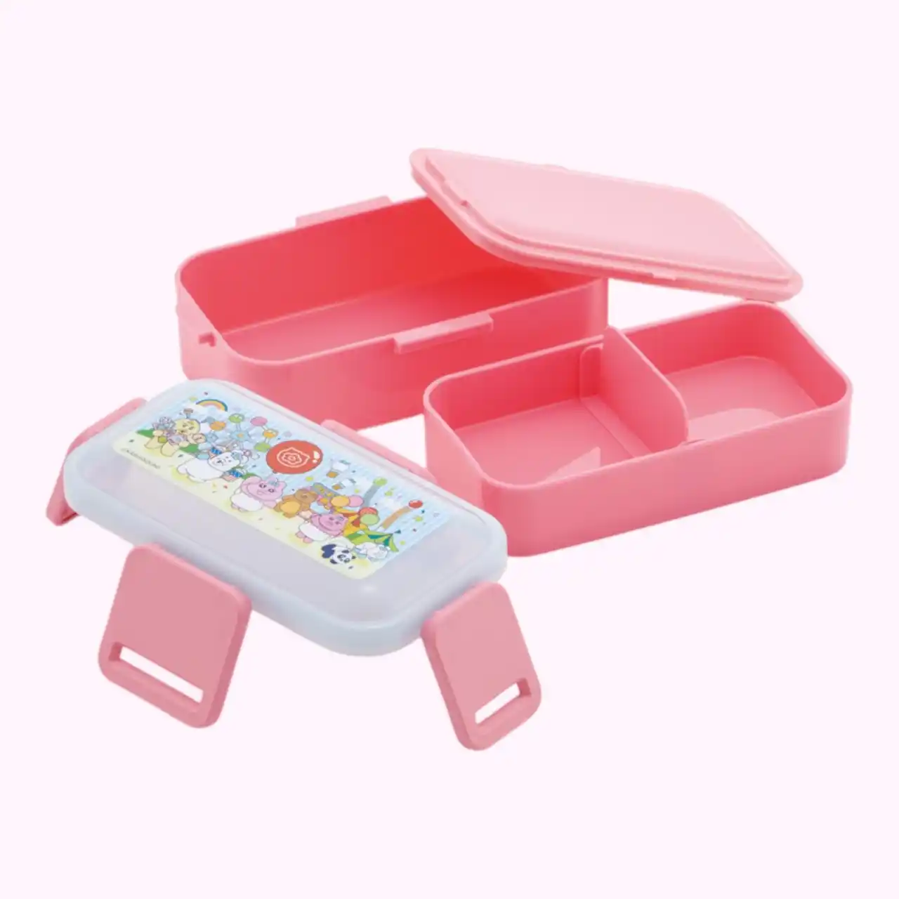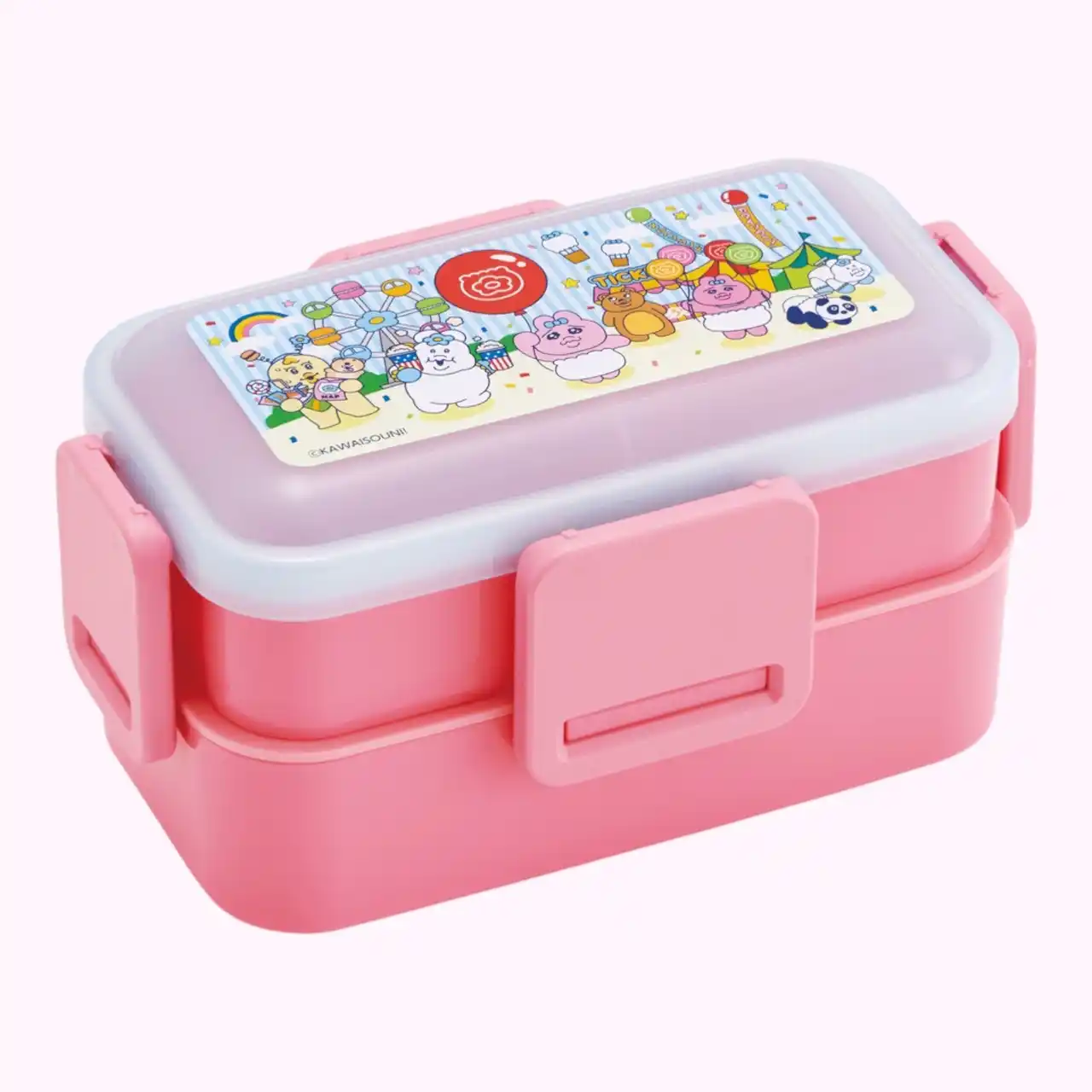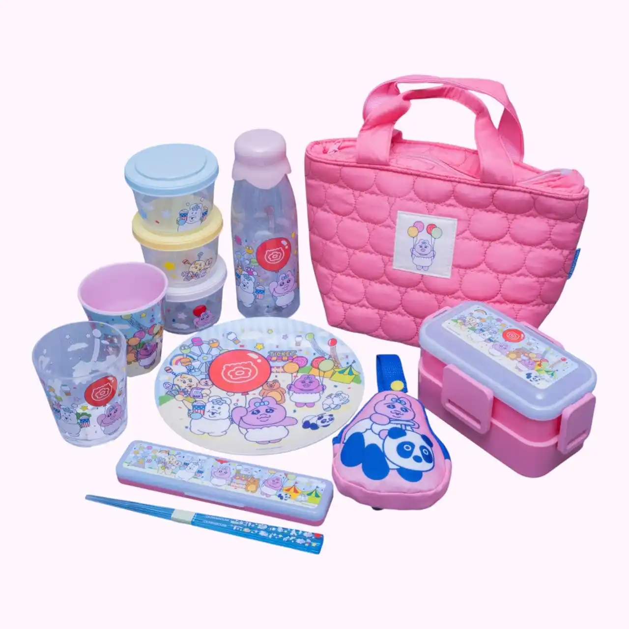 「おぱんちゅうさぎ」や「んぽちゃむ」のポップで賑やかな世界観を表現!お弁当箱やエコバッグなど、日常使いに便利なアイテムが勢揃い。