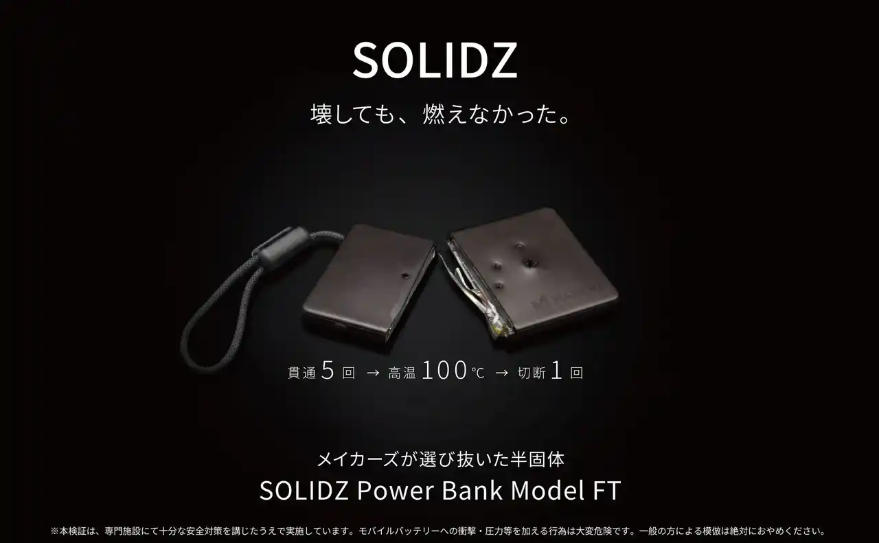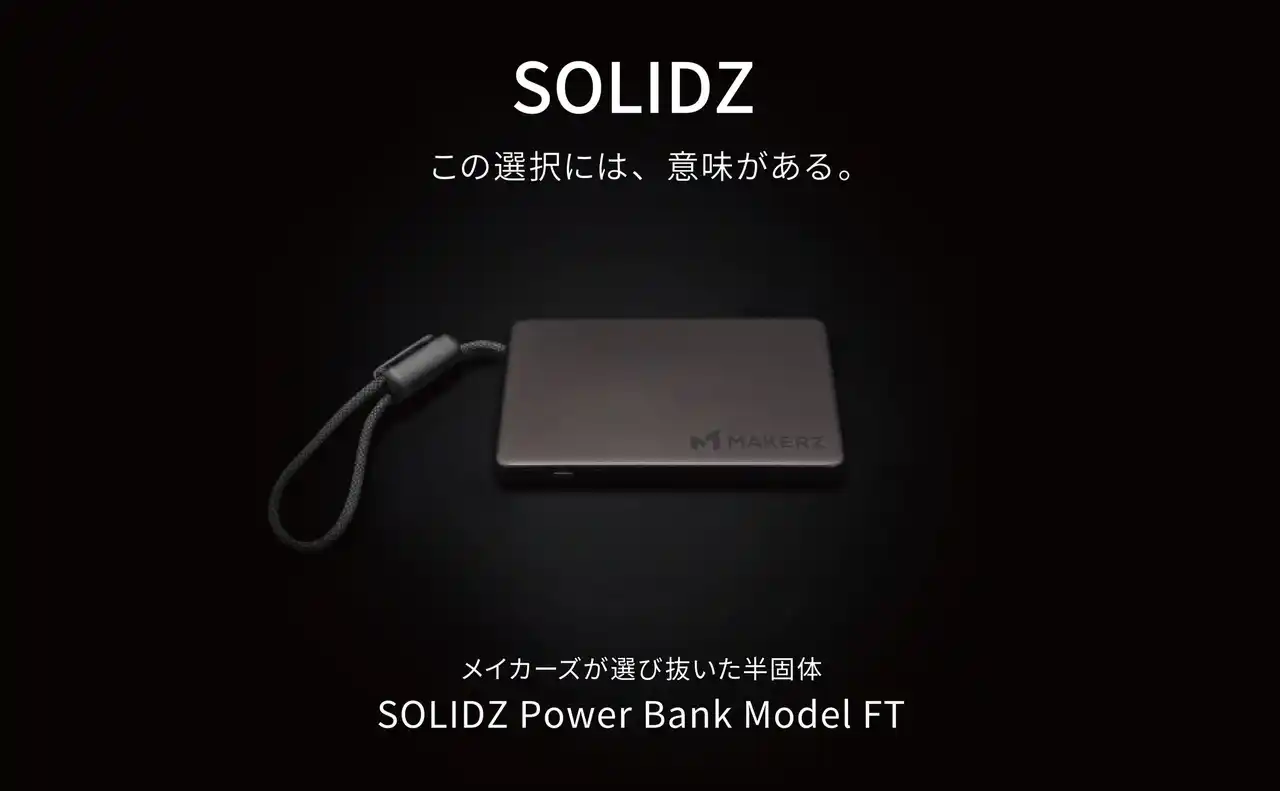 株式会社キーエンス100%出資の新規事業会社、株式会社メイカーズ(本社:大阪市北区、代表取締役社長:橋本洋平)は、半固体電池を採用したモバイルバッテリー『SOLIDZ Power Bank Model FT』をAmazonにて販売開始しました。電池構造そのものから見直した安全設計が最大の特長です。 |