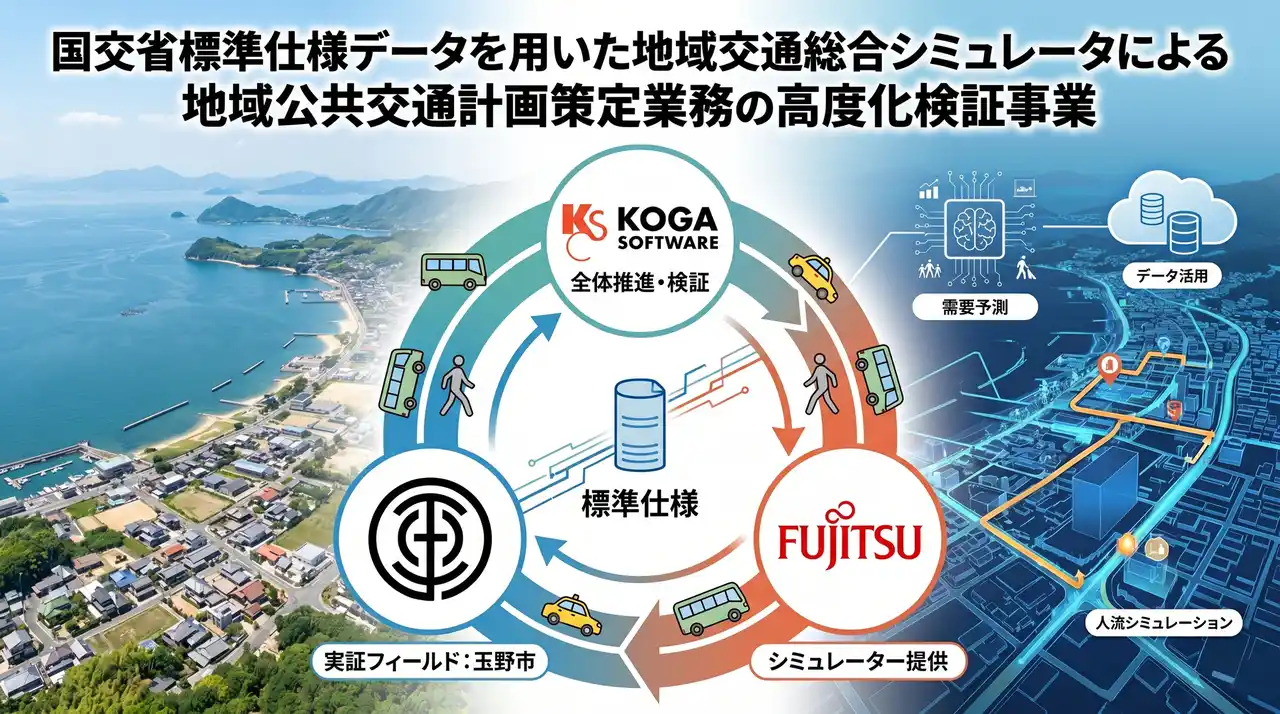 コガソフトウェア株式会社(本社:東京都台東区、代表取締役:古賀 詳ニ)は、国土交通省の令和8年度「『交通空白』解消等リ・デザイン全面展開プロジェクト」地域交通DX推進タイプにおいて、提案事業「国交省標準仕様データを用いた地域交通総合シミュレータによる地域公共交通計画策定業務の高度化検証事業」が採択されたことをお知らせいたします。 |