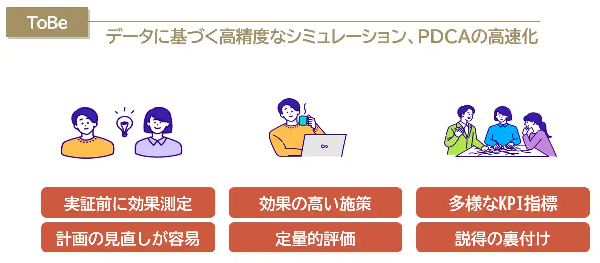 自治体職員自身で直感的に複数の施策パターンを比較検討できるため、外部委託費用や検討時間を削減し、環境変化に合わせた柔軟でタイムリーな計画見直しが実現します。 |