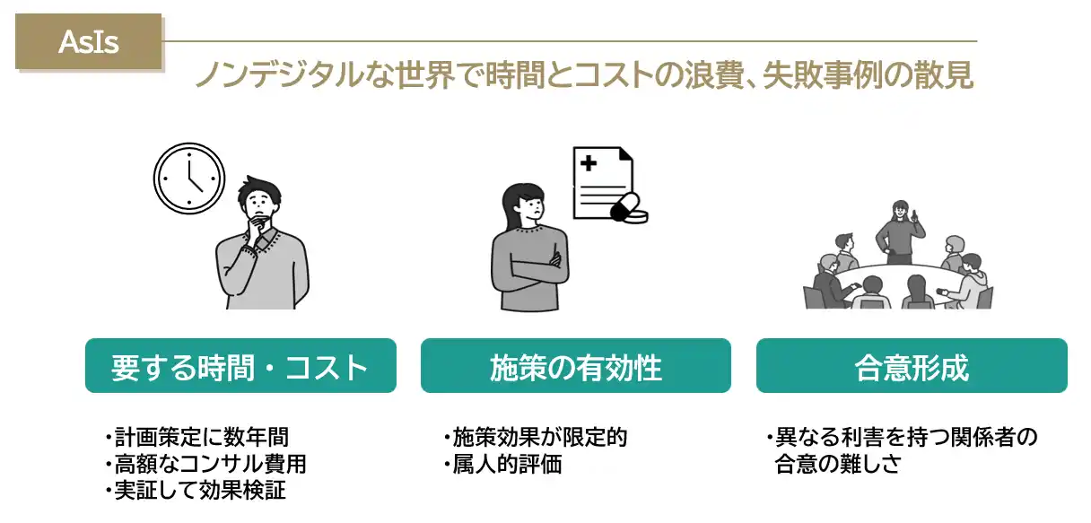 玉野市では、乗合デマンドタクシー「シータク」やコミュニティバス「シーバス」、路線バスといった公共交通網が市民の足として確立しています。しかし、人口減少や深刻な運転手不足に加え、これまでのその時々の課題に対するパッチワーク的な対応により、路線やサービス内容が複雑化しているという課題がありました。 また、従来の地域公共交通計画の策定においては、データ収集や分析が困難であり、一部の自治体担当者や専門家、コンサルタントの経験・ノウハウに依存しがちでした。そのため、路線バスとデマンド交通を組み合わせた際の全体最適を図ることが難しく、交通事業者や住民を含めたステークホルダー間で、納得感のある合意形成を図るまでに膨大な時間とコストを要していました。 |