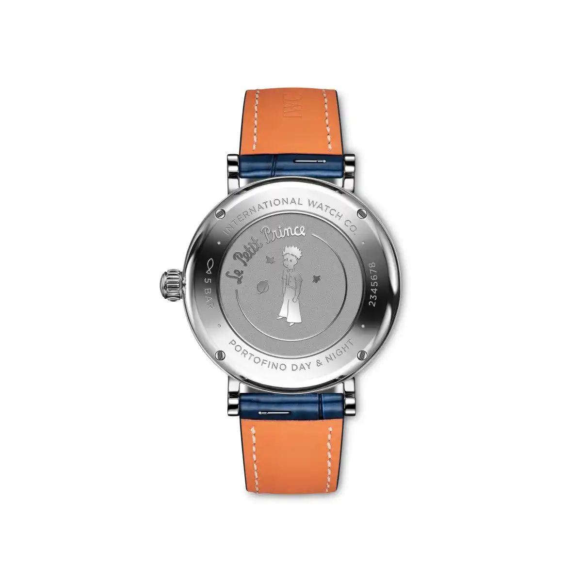 この時計の特徴は6時位置のデイ&ナイト表示です。昼と夜の連続的な移り変わりを視覚化し、24時間で1回転します。正午または真夜中になると、小さなディスクの上部に太陽または月が現れ、現在が昼であるか夜であるかを示します。魅力的なデザインのディテールとして、星の王子さまが月の上に立ち、星空を見上げている様が描かれています。また、ステンレススティール製の裏蓋にも「星の王子さま」の刻印が施されています。 |