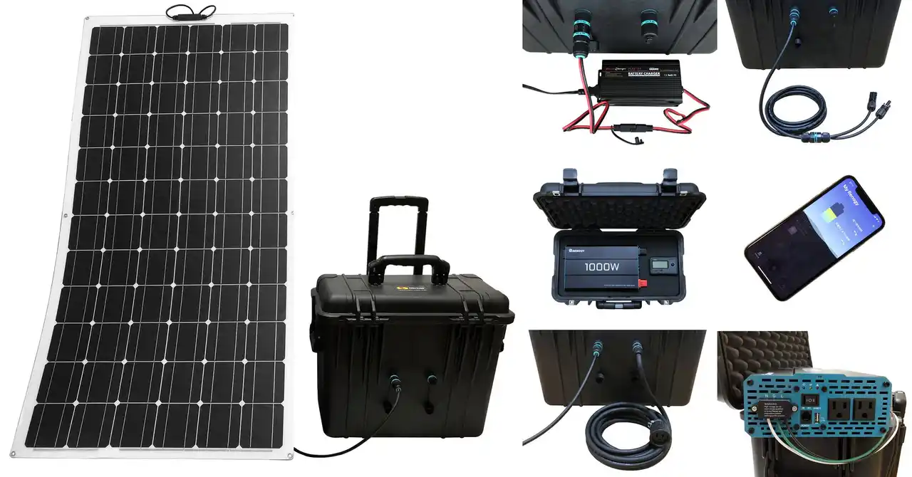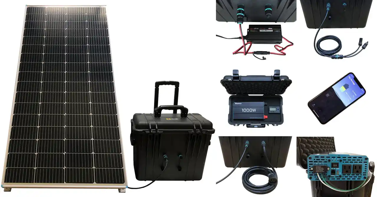 | ●電池は、内圧調整機能付きで安全な、保護等級IP67防水・防塵仕様の米国ペリカンケースに内蔵しています。持ち運びに便利な着脱式ショルダー・ストラップまたは伸縮ハンドルおよびキャスター付きです。 | |||