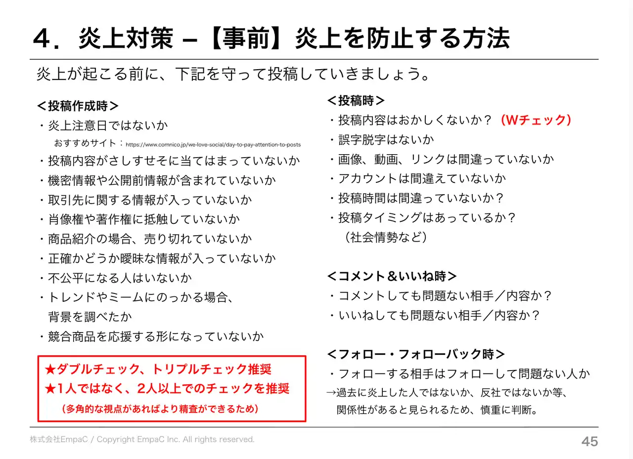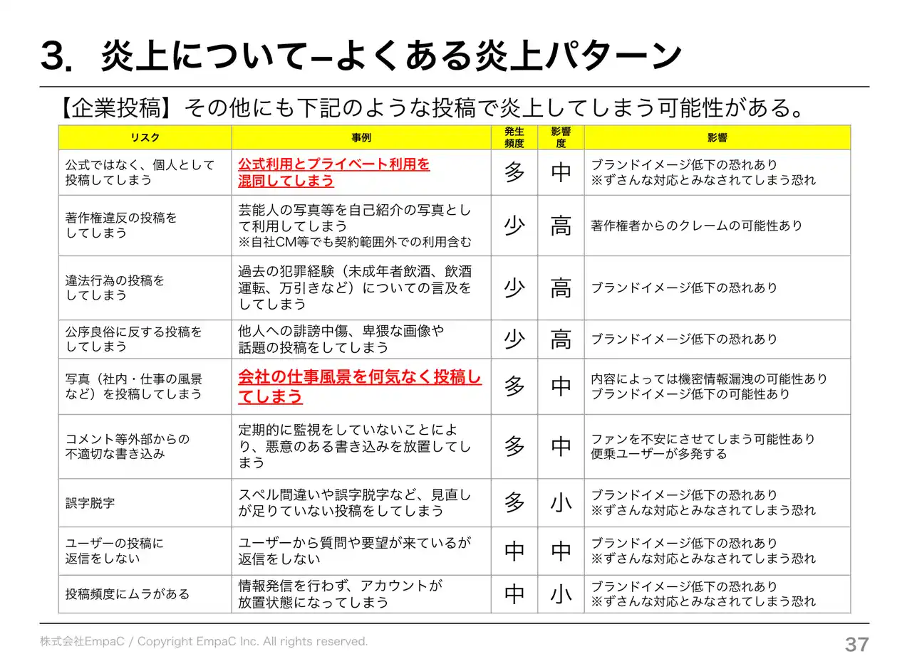 EmpaCでは、企業アカウント運用における炎上対策研修に加え、社員個人向けSNSリテラシー研修、SNSガイドライン整備、緊急時対応フロー設計まで一貫してご相談いただけます。 |