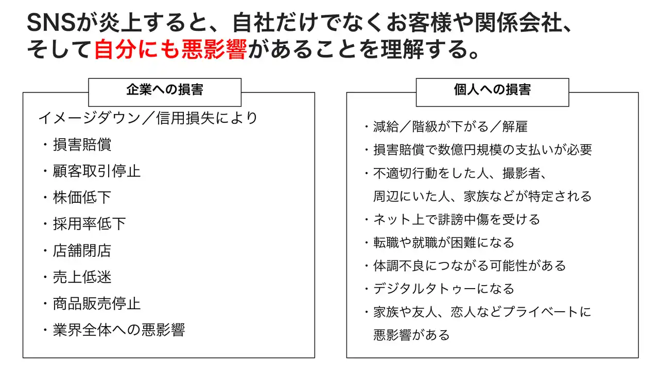 社員個人向け研修では、公式アカウント担当者に限らず、全社員・店舗スタッフ・アルバイト・内定者などを対象に、「個人の投稿が会社や自分自身にどう影響するのか」をわかりやすく整理します。 |