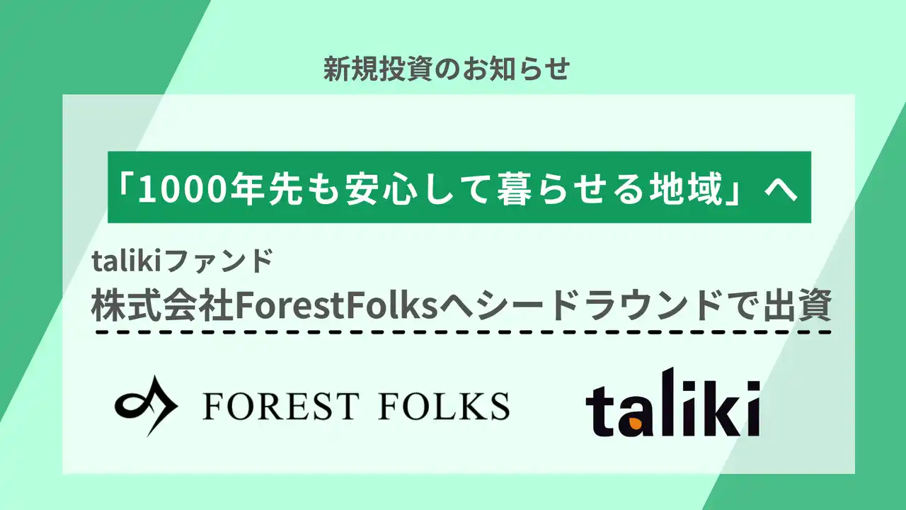 | 株式会社taliki(本社:京都府京都市、代表取締役:中村多伽、以下「当社」)が運営するtaliki2号ファンド(以下「当ファンド」)は、森林アセットマネジメント事業を展開する株式会社ForestFolks(本社:新潟県南魚沼市、代表取締役:桜井隆志、以下「ForestFolks社」)に対し、シードラウンドにて第三者割当増資による投資を実行いたしました。 | |||||||||||||||||||||||||||||||||||