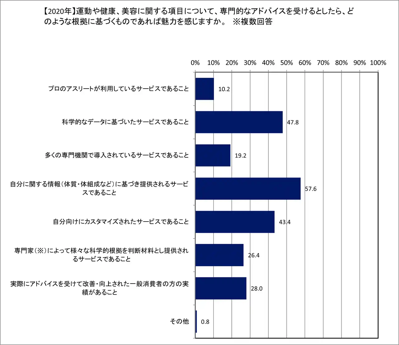 | 消費者が専門的なサービスを選ぶ際、どのような根拠に魅力を感じるかを聞いたところ、2026年調査でも「自分に関する情報(体質・体組成など)に基づき提供されるサービスであること」が50.0%で圧倒的トップとなり、次いで「自分向けにカスタマイズされたサービスであること」(43.0%)が高い支持を集めました。 | |||