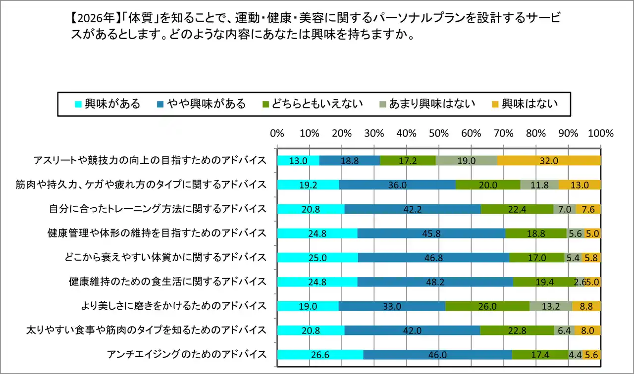 | また、提供してほしい具体的なアドバイス内容への関心を見ても、「アンチエイジングのためのアドバイス」(計72.6%)や「どこから衰えやすい体質かに関するアドバイス」(計71.8%)への興味が極めて高く、自身の将来の衰えやリスクに先回りして備えるための「自分の体質」を知るニーズが強いことが分かります。 | |||