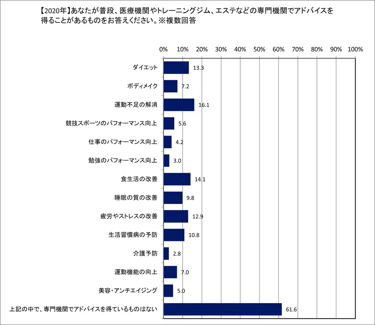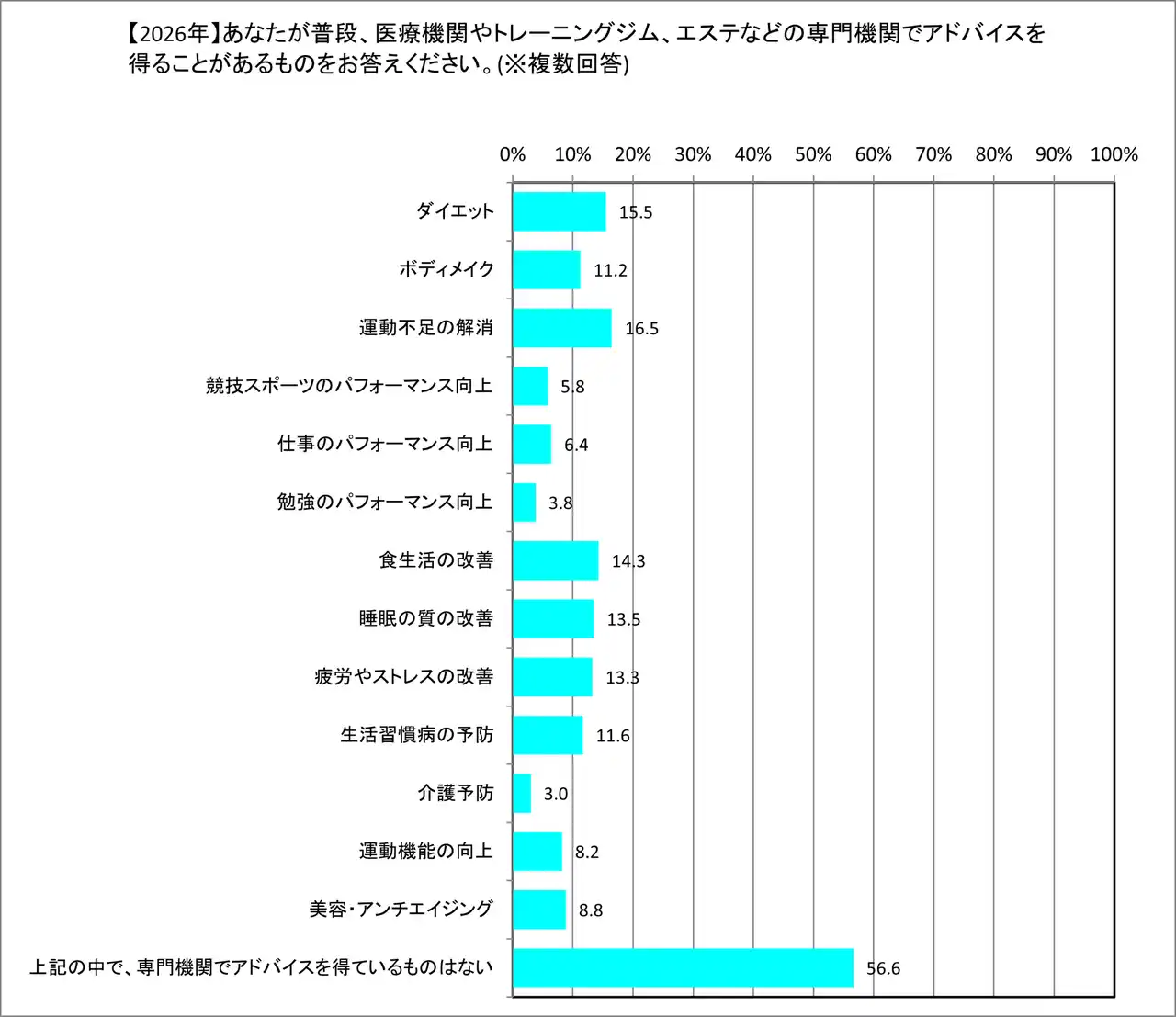 | こうした「自己流の限界」を背景に、人々の行動は専門機関(プロ)を頼る方向へシフトしています。医療機関やジムなどの専門機関からアドバイスを「得ているものはない」と答えた人は61.6%(2020年)から56.6%(2026年)へと減少し、何らかの形でプロの介入を求めて行動する人が増えています。 特に、「睡眠の質の改善」(9.8%→13.5%)や「ボディメイク」(7.2%→11.2%)、「美容・アンチエイジング」(5.0%→8.8%)といった、基礎的な健康維持から一歩踏み込んだ、より専門的で個人のQOL(生活の質)に直結する深い悩みに対する領域での利用率が大きく伸びており、健康意識がより高度なものへと進化していることがわかります。 | |||