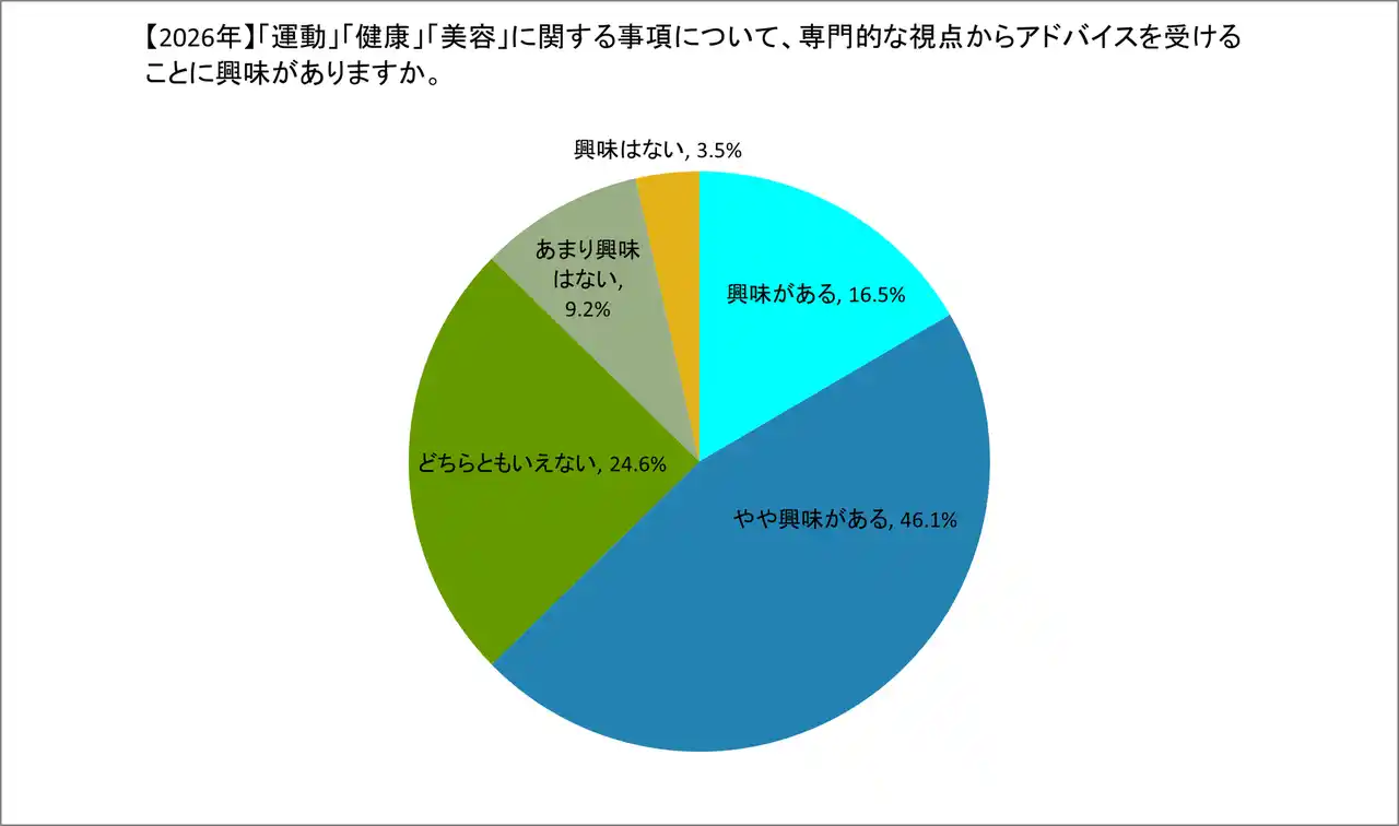 | 一方で、運動・健康・美容について「専門的な視点からアドバイスを受けること」に対する興味は、「やや興味がある」を含め全体で62.6%に達しています。しかし前述の通り、実際の専門機関利用者は半数以下にとどまっており、「強い興味はあるものの、まだ自分に合ったサービスに巡り会えていない、あるいは一歩を踏み出せていない」という巨大な潜在市場が存在していることが浮き彫りになりました。 | |||