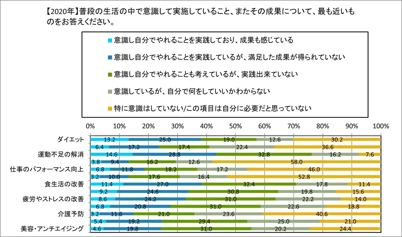 | コロナ禍初期の2020年は、自宅でのトレーニングなど手探りで「自己流の健康管理」に取り組む人が多数見受けられましたが、2026年の調査ではその限界が顕著に表れています。 普段の生活での取り組み状況において、自ら「実践している」人の割合が軒並み減少する一方で、「意識しているが、自分で何をしていいかわからない」と回答する層が増加しました。 | |||