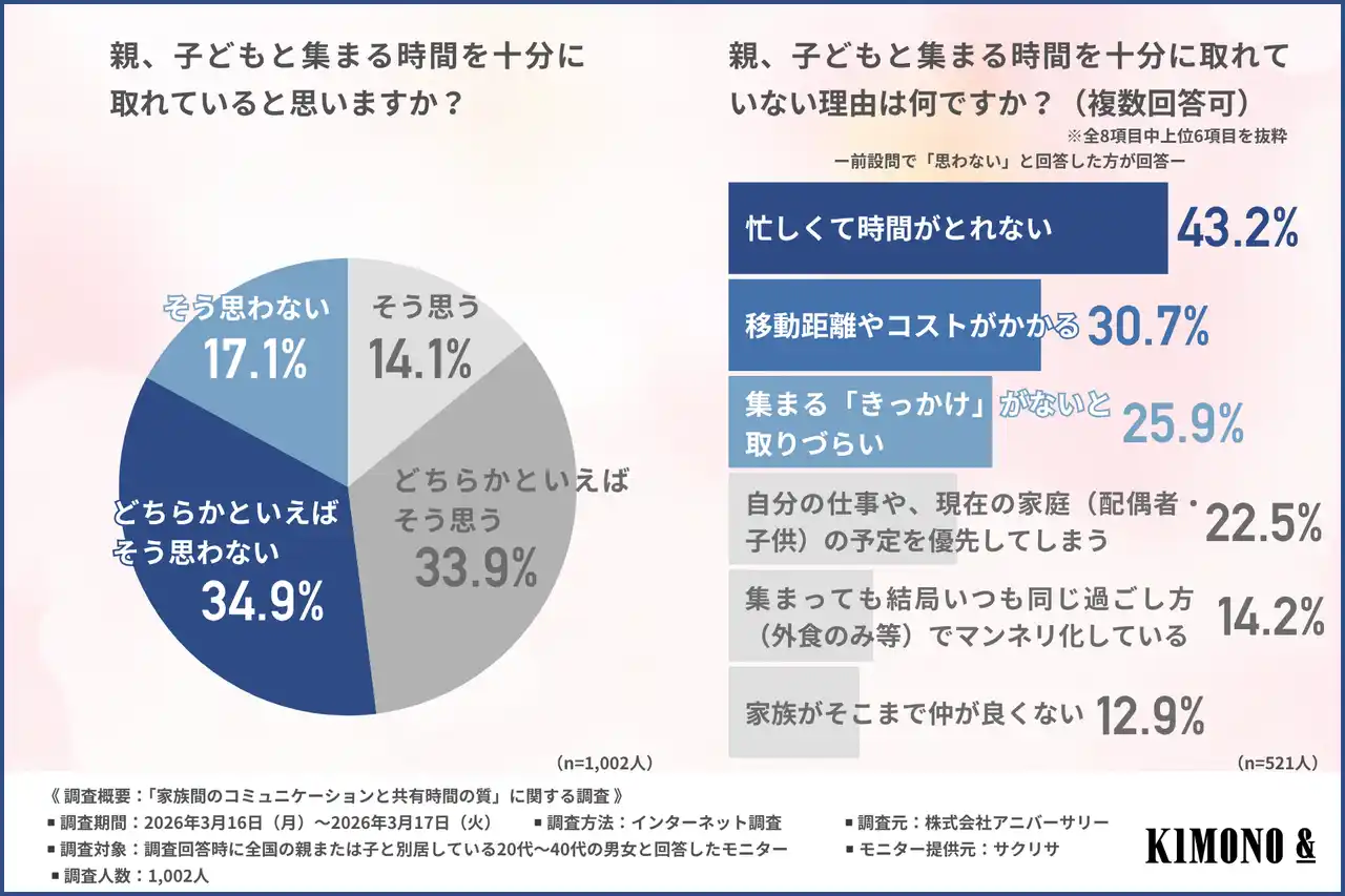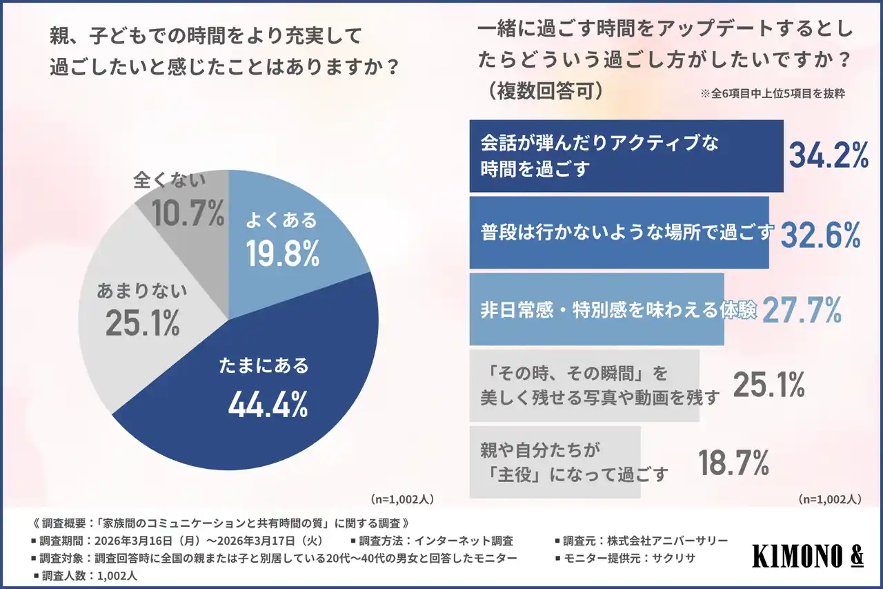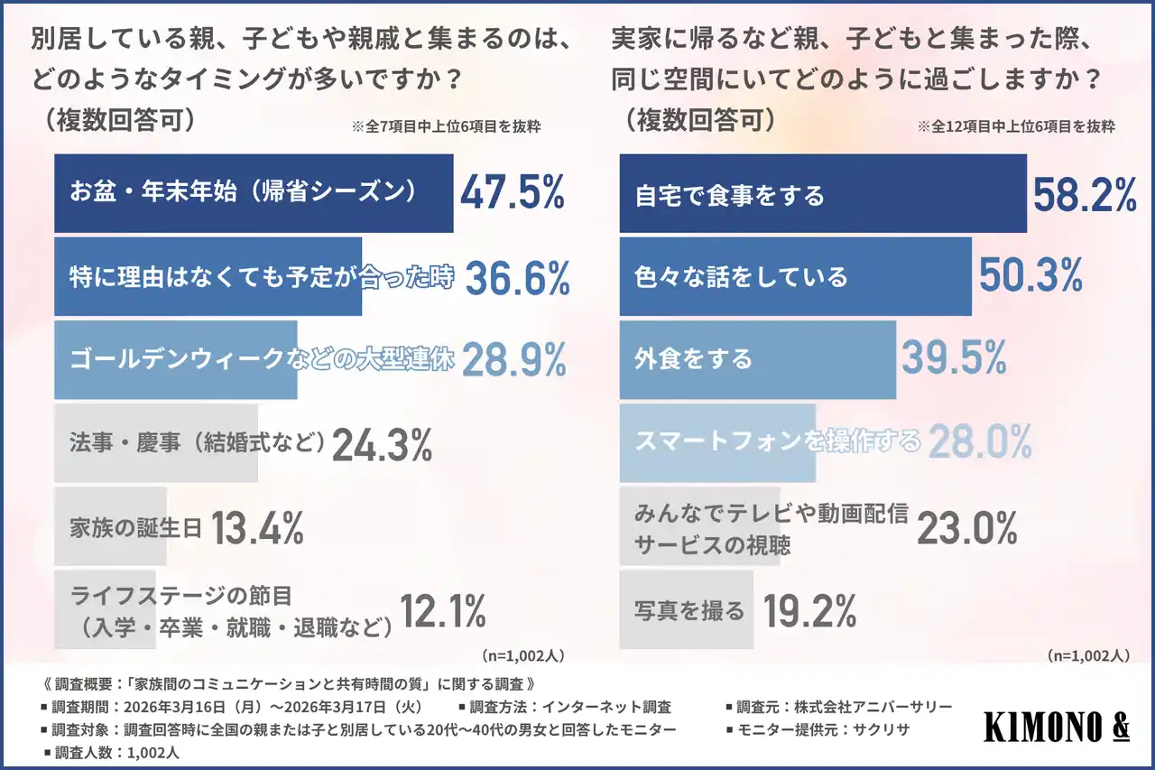 そこで今回、株式会社アニバーサリー(振袖・袴レンタル・フォトスタジオ「KIMONO&(キモノアンド)」を運営 https://kimonoand.kimono-yamato.co.jp/)は、全国の親または子と別居している20代~40代の男女を対象に、「家族間のコミュニケーションと共有時間の質」に関する調査を実施しました。 |
