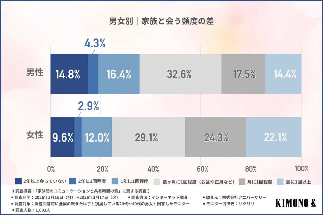 一方で、『1年に1回程度』『2年に1回程度』『2年以上会っていない』と回答した割合は、男性が約4割に対し、女性は約2割となり、男性の方が相対的に会う頻度が低い傾向のようです。 |