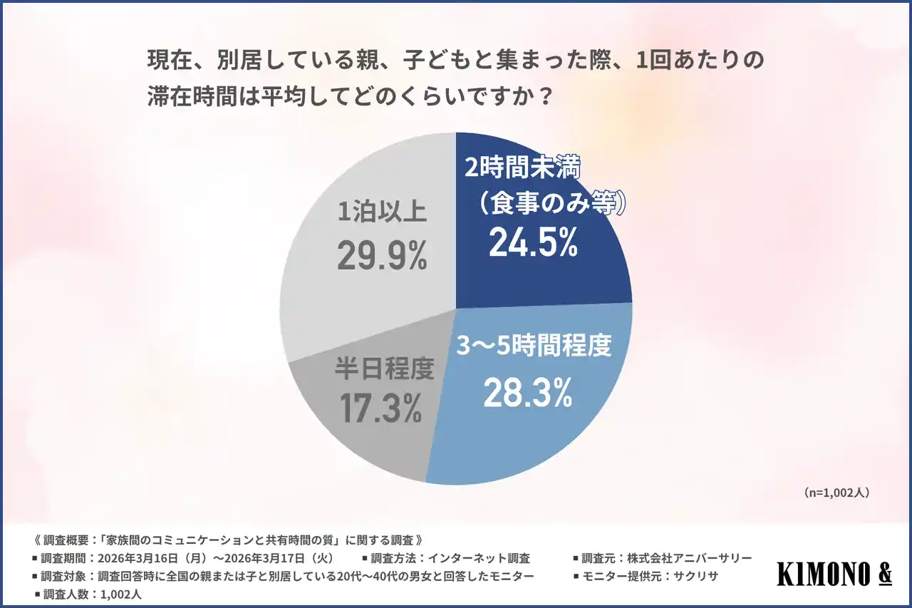 Q3「現在、別居している親、子どもと集まった際、1回あたりの滞在時間は平均してどのくらいですか?」と質問したところ、『2時間未満(食事のみ等)(24.5%)』『3~5時間程度(28.3%)』と半日も家族時間を過ごさない方が半数以上にのぼりました。 |