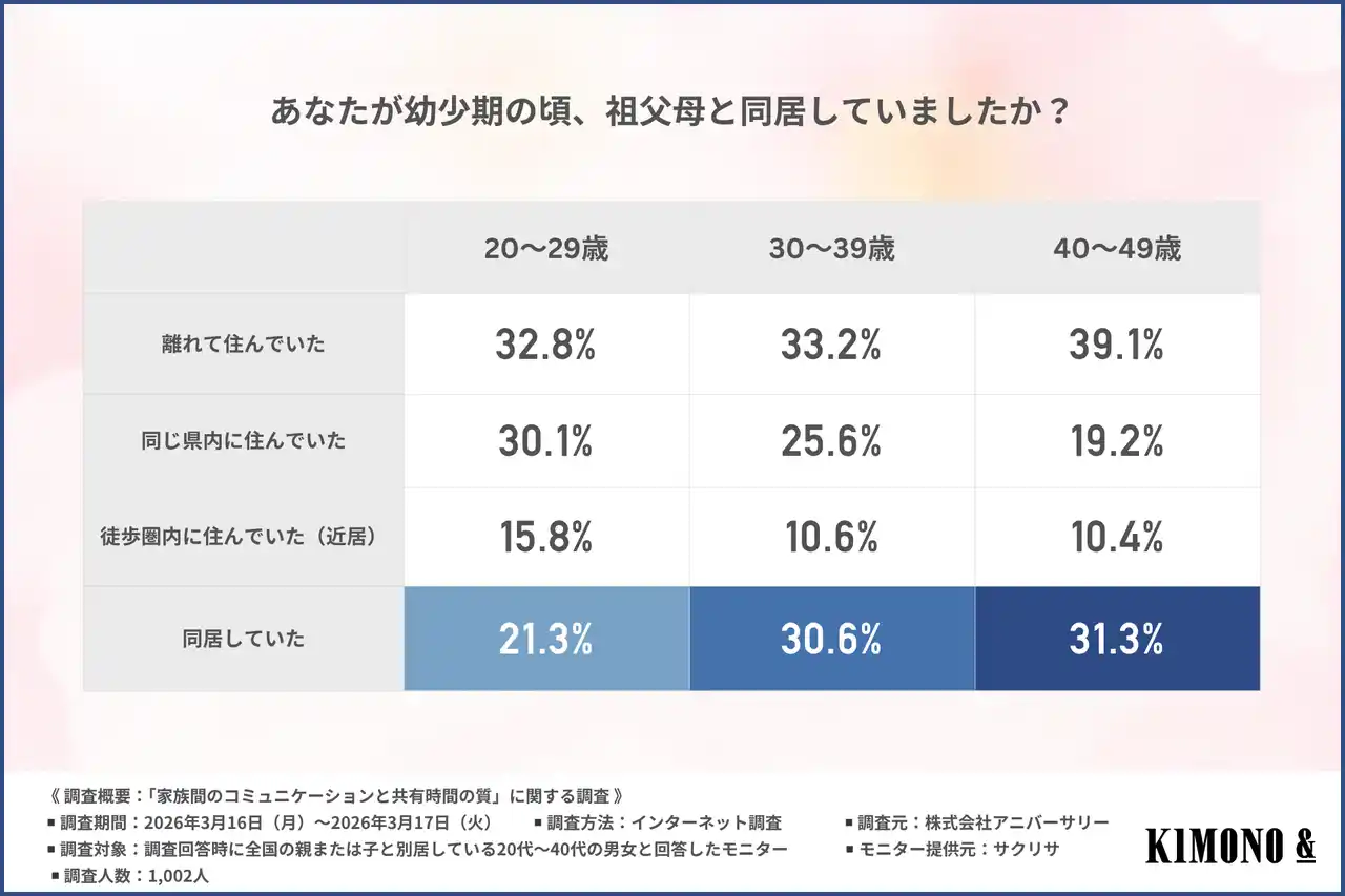 近年、核家族化やライフスタイルの多様化により、家族が一堂に会する機会は減少傾向にあります。実際に20~40代への調査では、年代が下がるにつれて祖父母との同居率は低下しており、社会全体で核家族化が進行してきた背景がうかがえます。 |