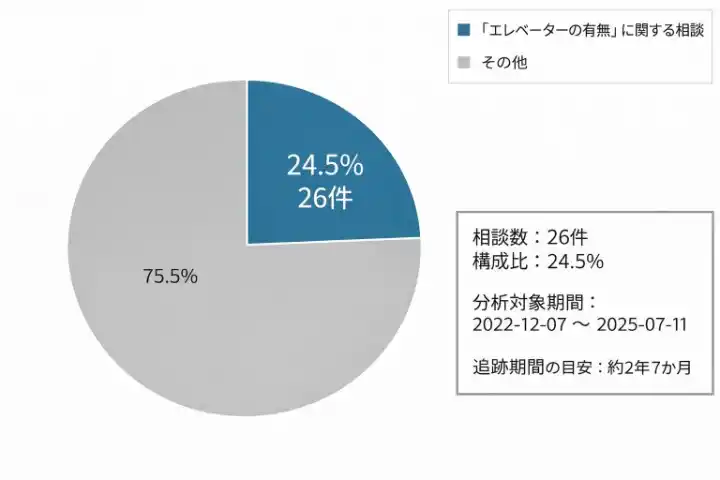 その結果、エレベーターの有無に関する相談は26件、構成比は24.5%で、搬入前の確認事項として継続的に意識されていることが分かりました。 |