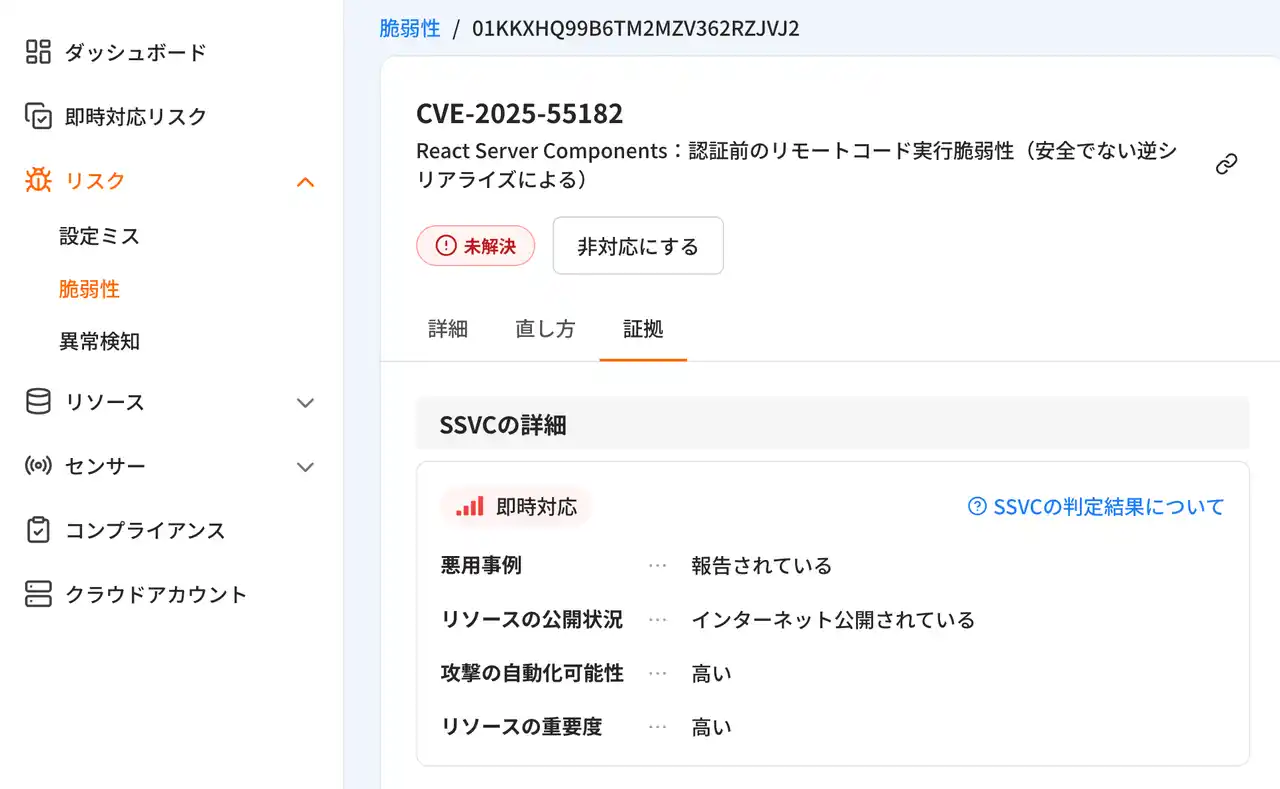 | また、認証なしでアクセス可能なAWS Lambda関数については、SSVCに基づいて「即時対応」リスクとして優先度を判定することが可能となりました。 | |||||||||