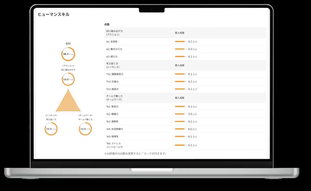 | AIログとプロ講師の評価を掛け合わせ、エンジニアの資質(OS)をレーダーチャートで可視化します。「自走力」や「ストレス耐性」など12項目のヒューマンスキルに加え、日報やロールプレイの分析から「思考の癖」や「現場での実践力」を証明。さらに、配属先の教育担当者へ向けた「処方箋(育成アドバイス)」を出力することで、新人を最速で戦力化し、ミスマッチや離職を防ぐ確実なバトンパスを実現します。 | ||||||||||||||||||||