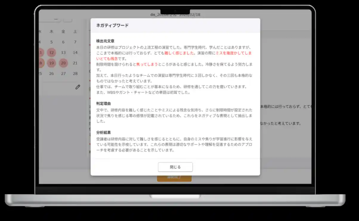 | 週次報告を待つことなく、日々の理解度テストや日報を通じて、受講者の「つまずき」や「悩み」を早期に把握できます。特に日報からはAIがネガティブな兆候を自動抽出するため、管理者は一人ひとりの課題のサインをいち早く察知することが可能です。さらに、出欠状況や入退室記録もシステム上で即座に確認でき、研修会社への都度の連絡も不要。受講者のコンディション変化を逃さず、最適なタイミングでのフォローアップを実現します。 | ||||||||||||||||||||
