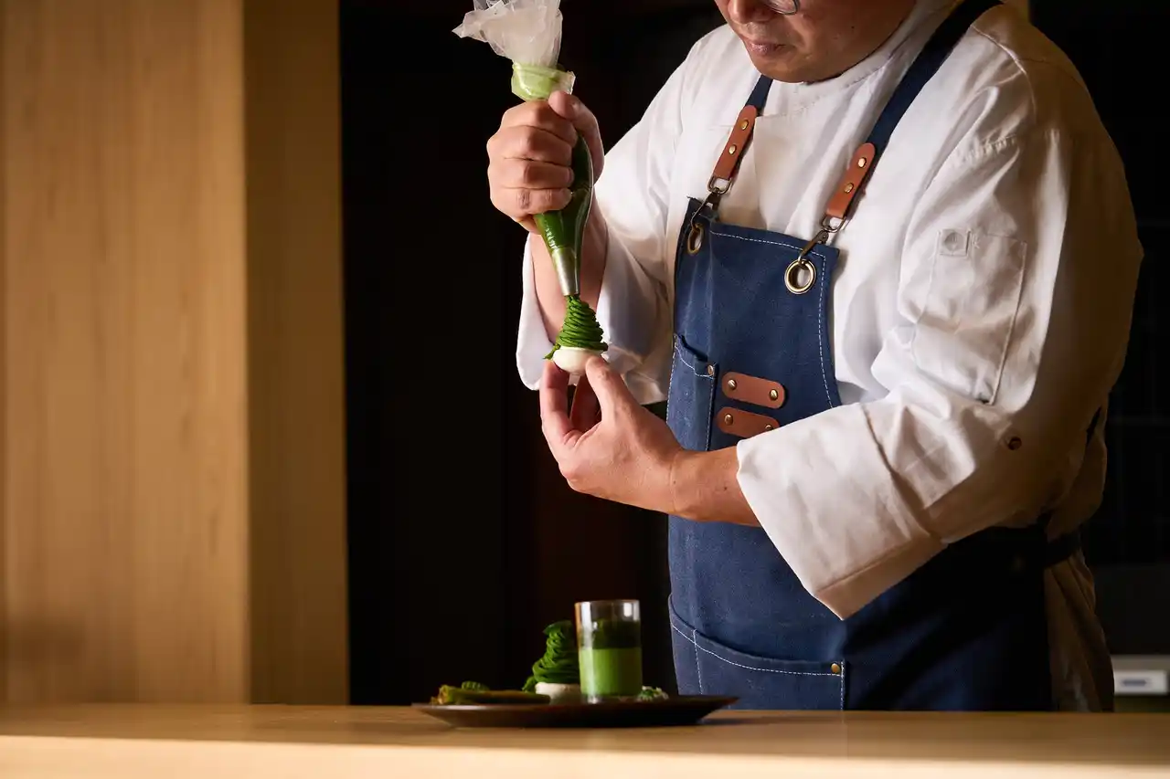 スイーツのひと皿、ひと皿、絶妙なバランスで提供され、迫力のある実演シーンを見ながら点てたてのお抹茶と共に、唯一無二のアフタヌーンティーをお楽しみください。 |