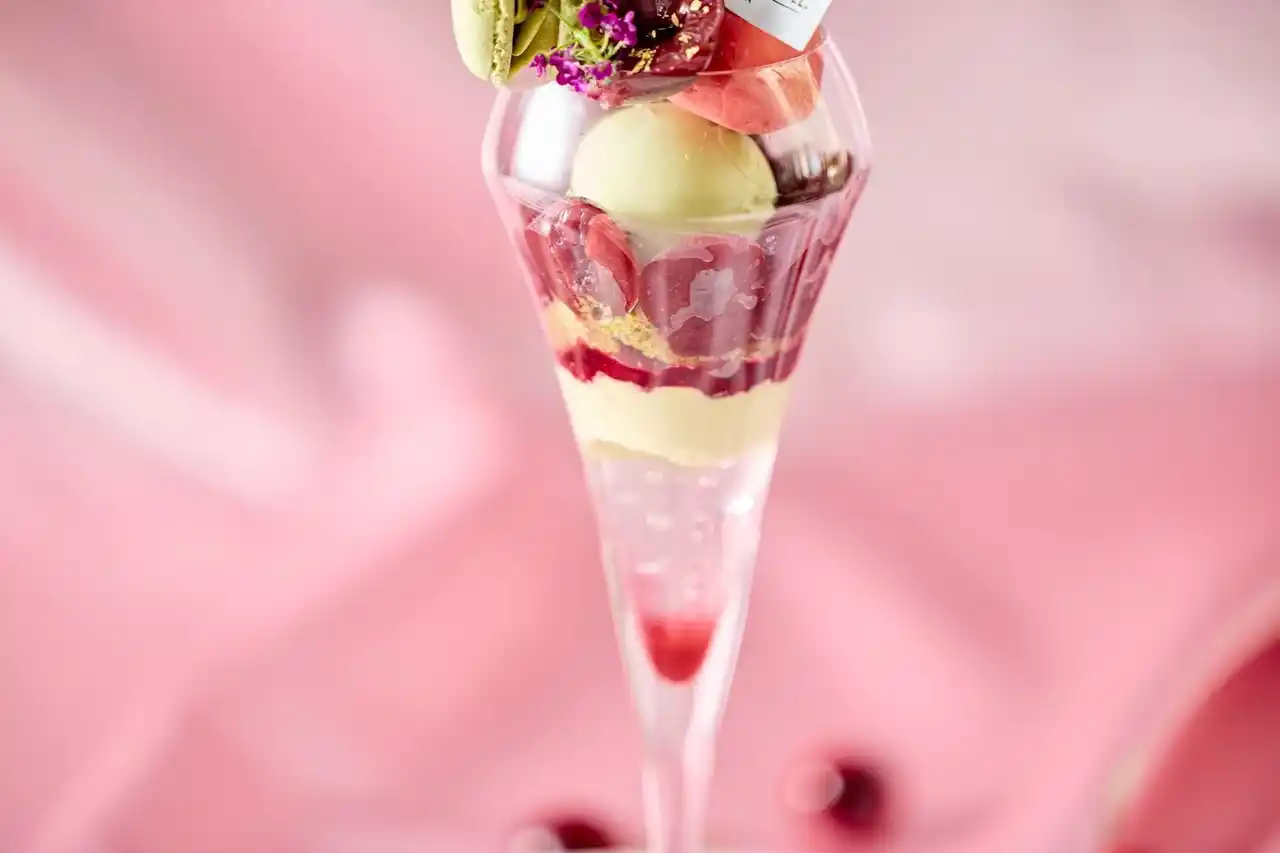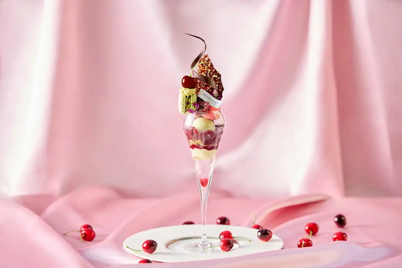 ピスタチオ~』を販売いたします。艶やかに輝く旬のダークチェリーと栄養価の高さ、鮮やかな緑色の美しさ、そして濃厚で上品な風味から“ナッツの女王”と称される芳醇なピスタチオを合わせたパフェは、まるでグラスの中に閉じ込められた気品溢れるジュエリーのような美しさ。アーティスティックに重なる層を食べ進めると、中からは濃厚で香ばしい「ピスタチオのアイスクリーム」と、甘酸っぱく煮詰められた「ダークチェリーのコンフィ」が現れます。ピスタチオブラウニーの深みのあるコクと、キルシュのジュレの香りが優雅に漂い、まさに贅沢を尽くした一杯に仕上げました。特別感あふれる大人のご褒美パフェをホテルのラグジュアリーな空間でお楽しみください。 |