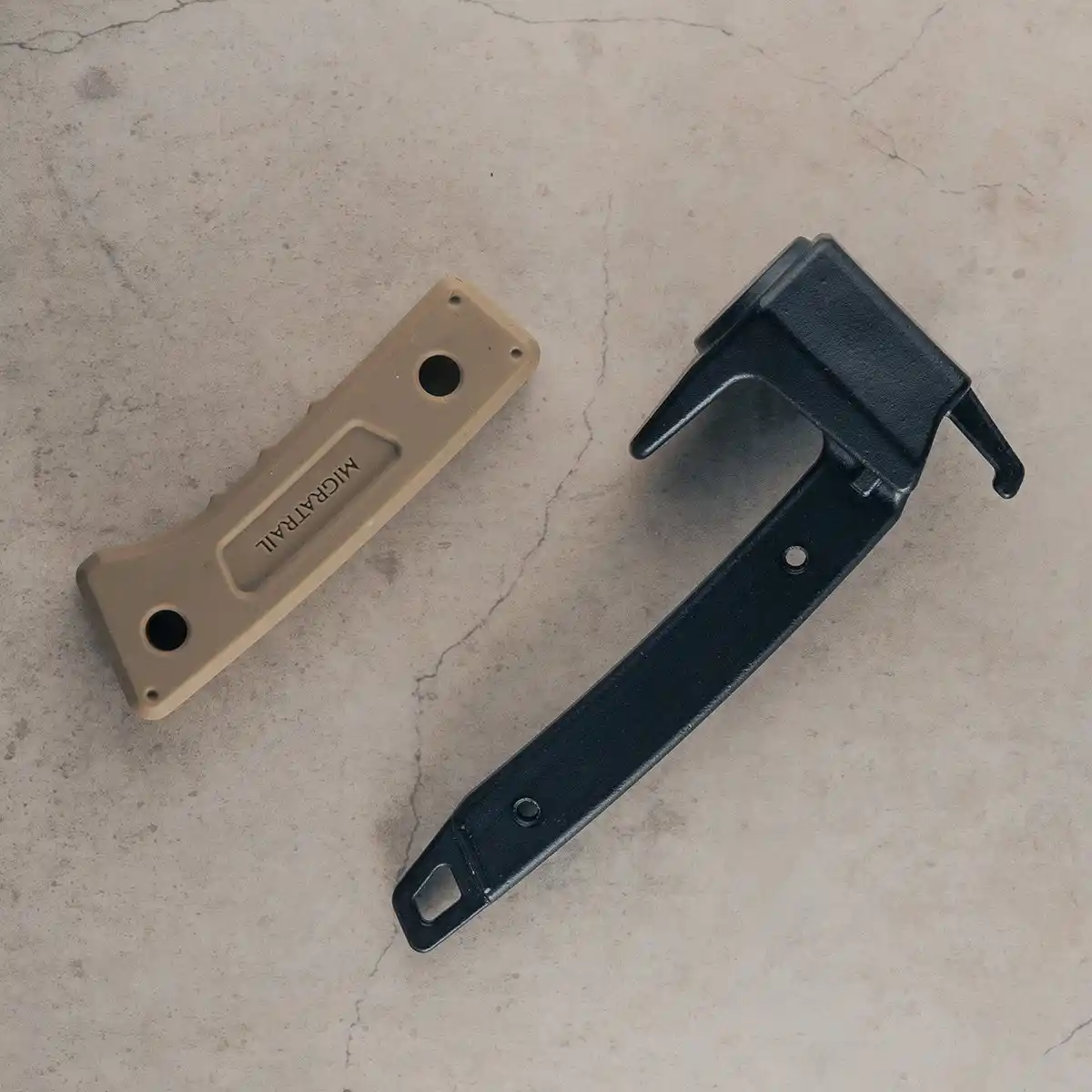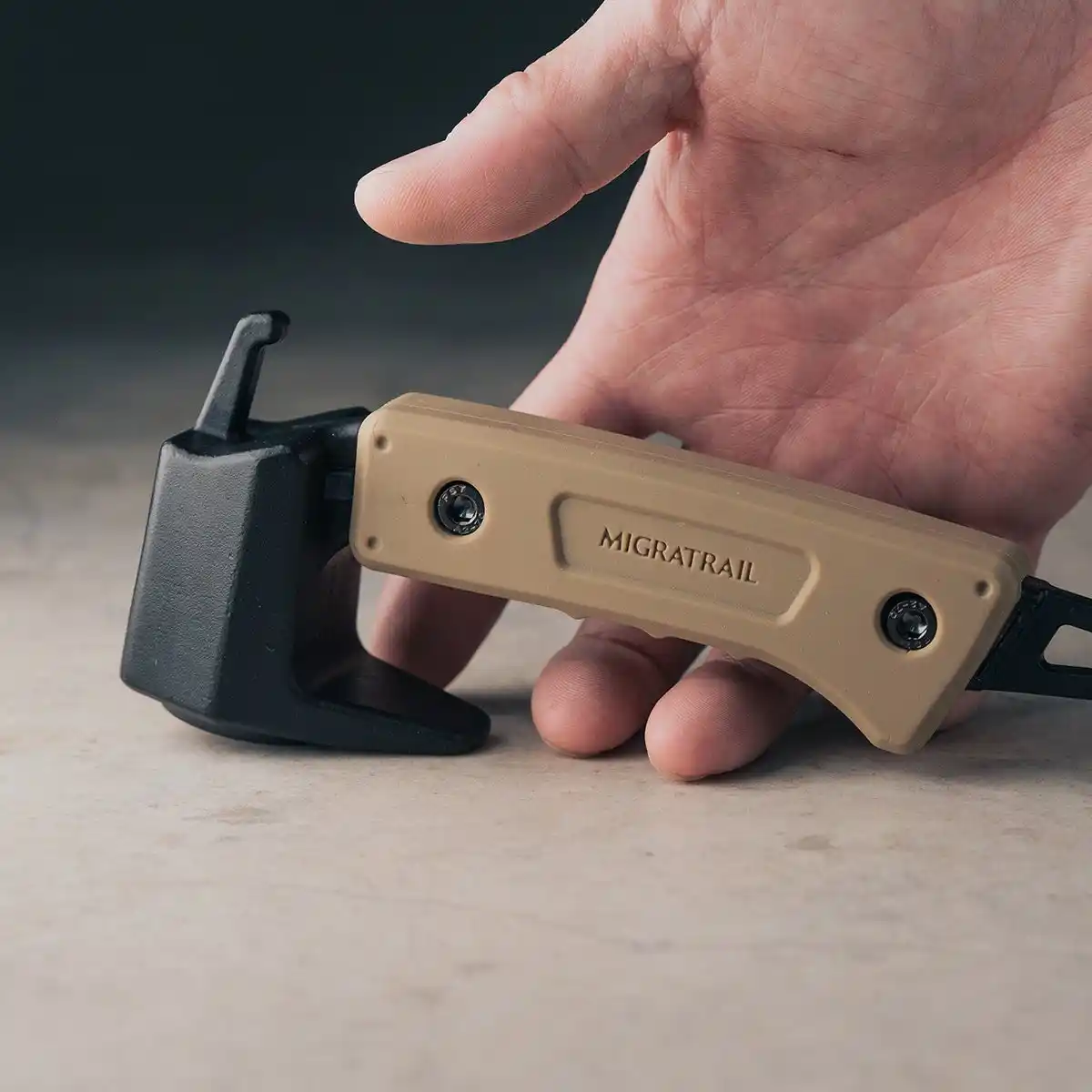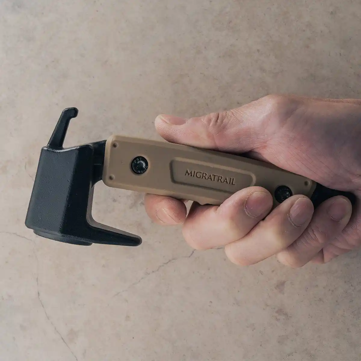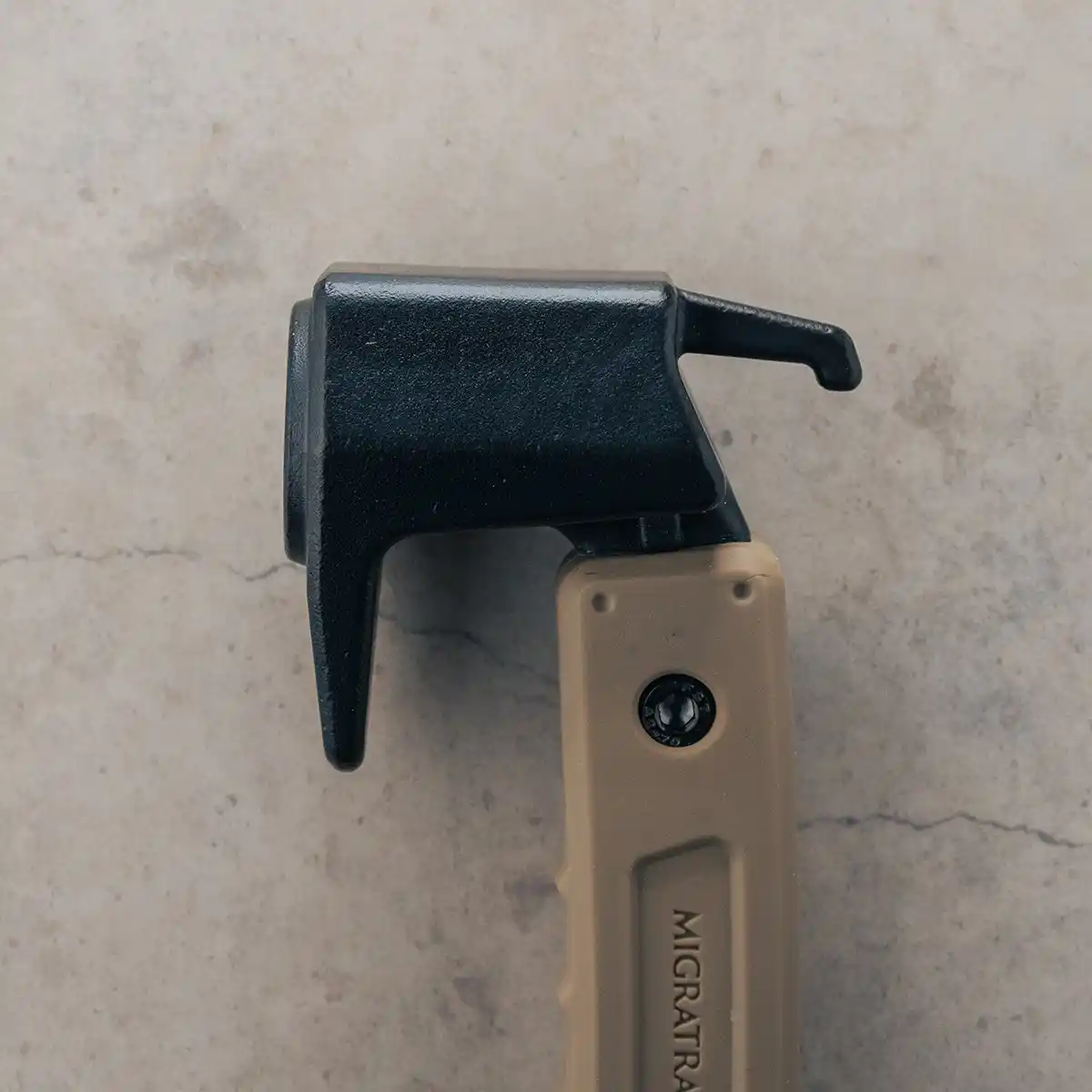 メインはフルタングのハンマーヘッドとグリップの2部品で構成されており、部品構成が少ないので破損のリスクや、長く使用している時に起こる各部のガタツキなどの心配がない。ペグを簡単に抜くことができる、ペグ抜きフックを装備。グリップエンドの穴に好みのパラコードを結べば、ハンガーフックにしたり、使用時の抜け防止のループとして使用できる。 |