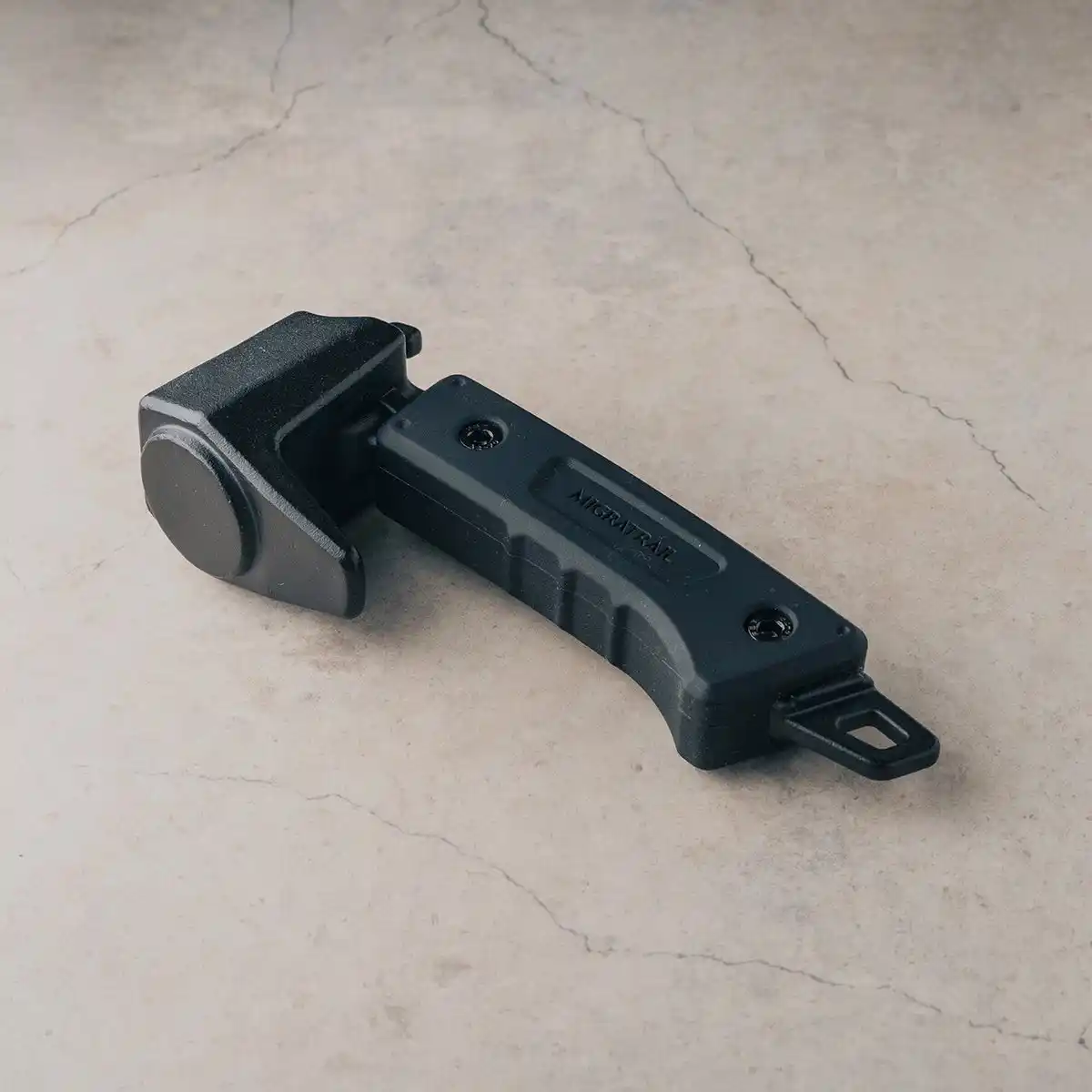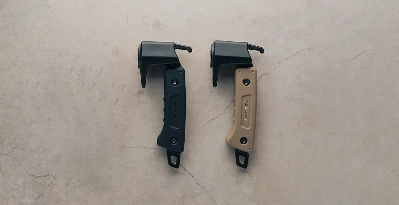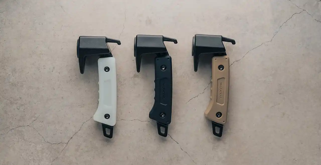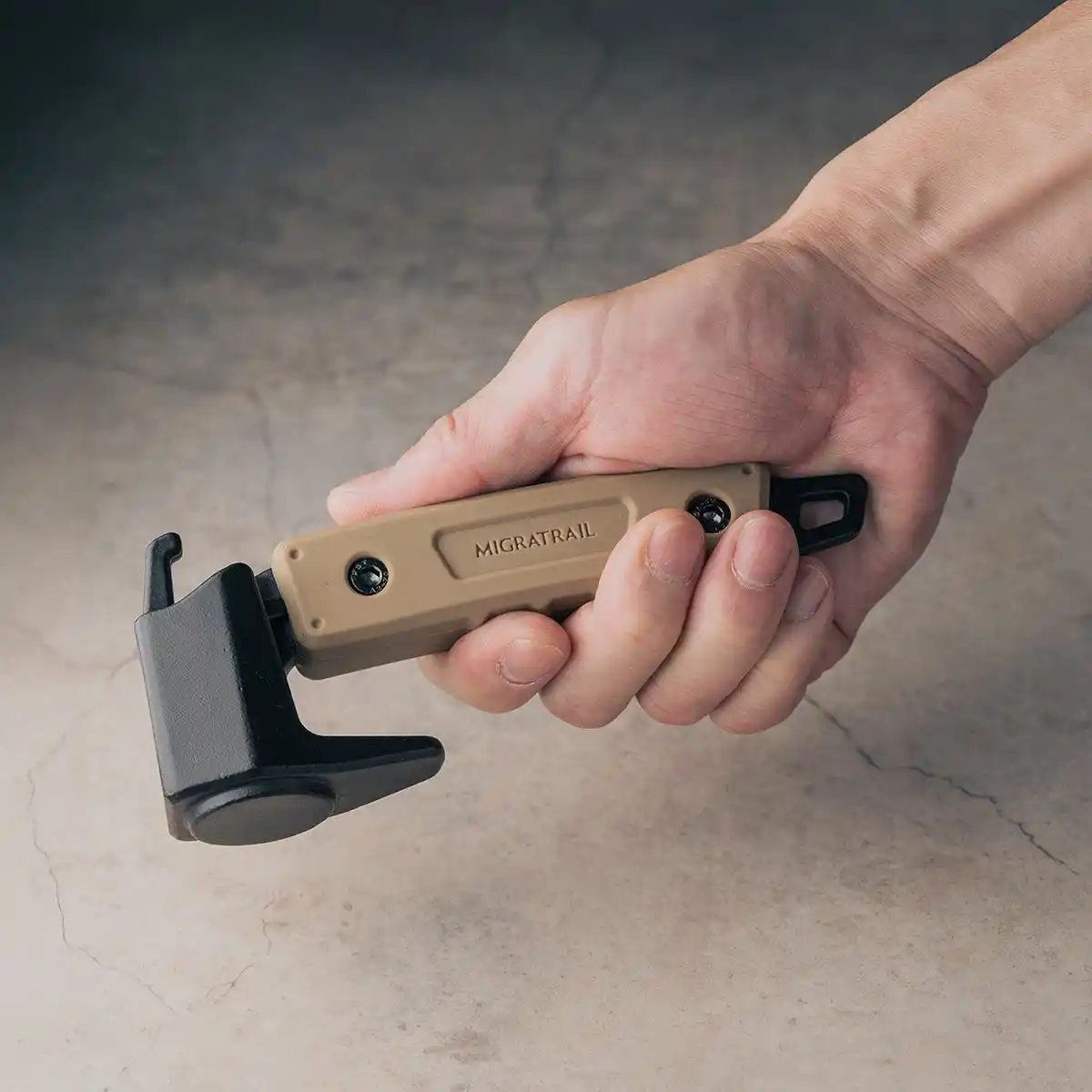 メインはフルタングのハンマーヘッドとグリップの2部品で構成されており、部品構成が少ないので破損のリスクや、長く使用している時に起こる各部のガタツキなどの心配がない。ペグを簡単に抜くことができる、ペグ抜きフックを装備。グリップエンドの穴に好みのパラコードを結べば、ハンガーフックにしたり、使用時の抜け防止のループとして使用できる。 |