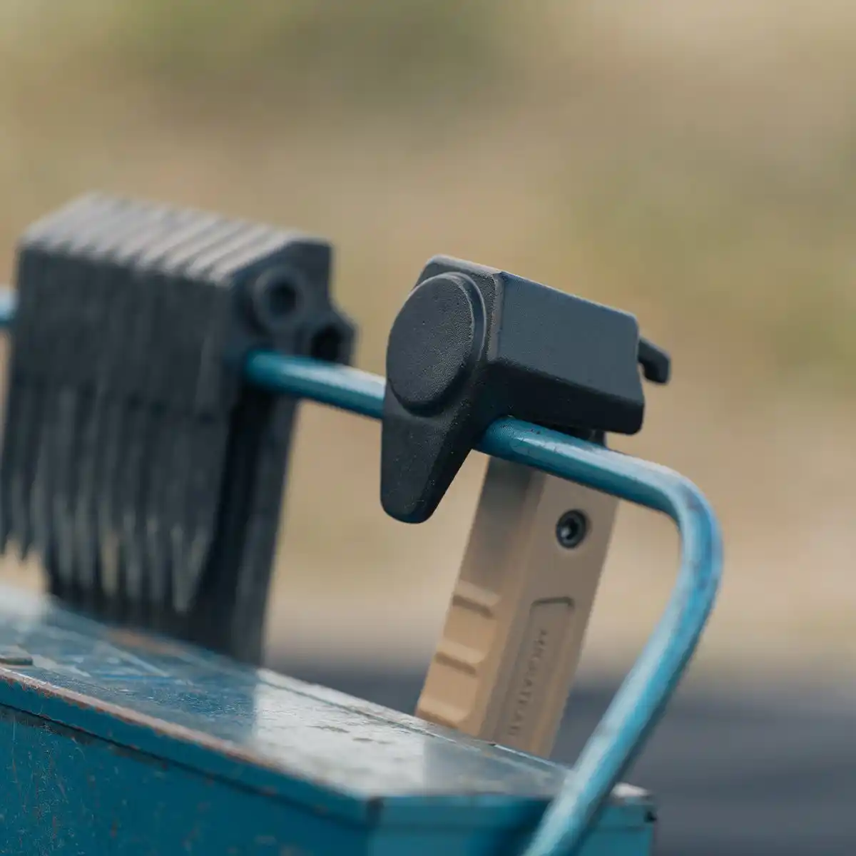 ハンマーヘッドのシールドデザインにより、テーブルなどに掛けることができる。地面ではなく目立つ場所に掛けておけば、コンパクトでもキャンプフィールドで見つけやすく紛失を防ぐ。 |