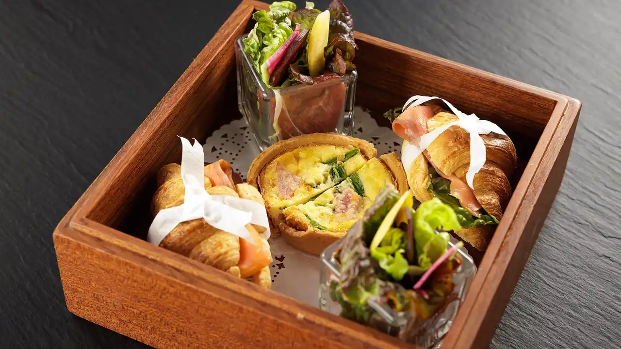 | ■1段目:キッシュ/グリーンサラダ/スモークサーモンのサンドイッチ | ||||||||||||||