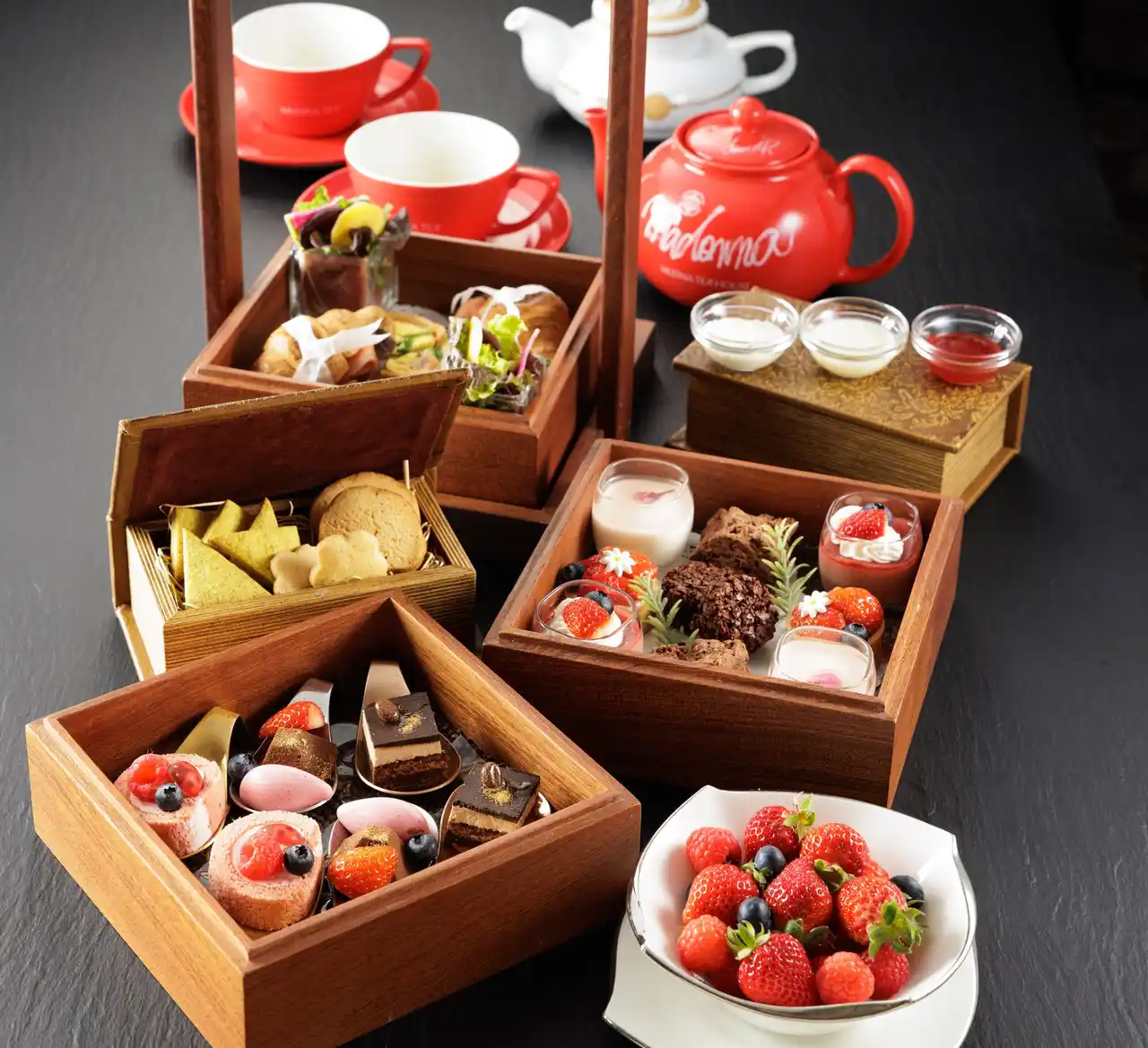 | 本メニューは、旬のいちごやベリーを使用した季節感あふれるスイーツとともに、ムレスナティーハウスのデビッド・K氏がセレクトした、日本人の味覚に合わせたジャパンブレンドを含む4種の紅茶とのペアリングを楽しめる内容です。 | ||||||||||||||