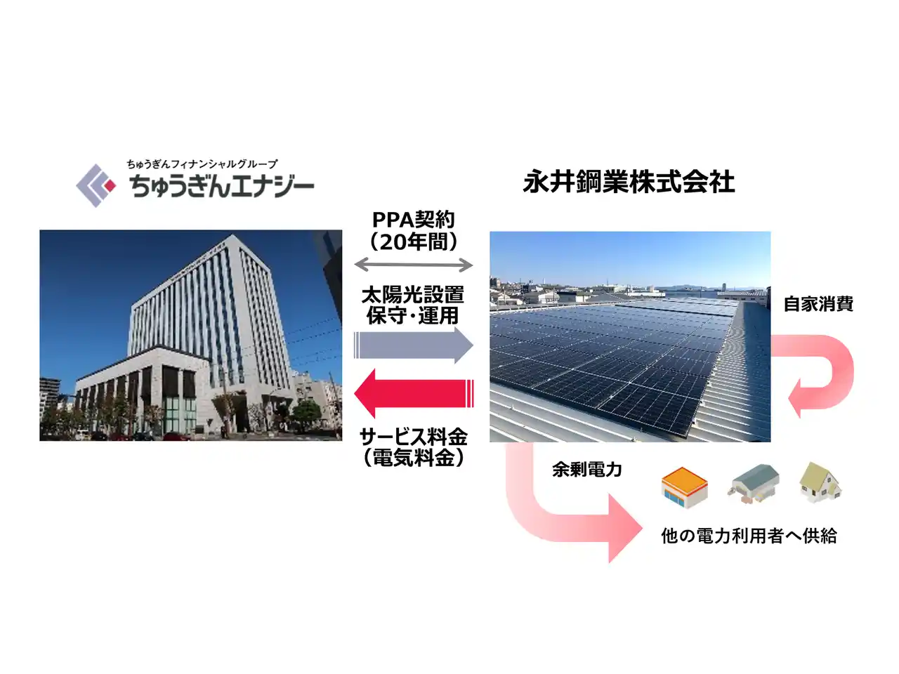 株式会社ちゅうぎんエナジー(岡山市 代表取締役 松岡 信一)は、永井鋼業株式会社(代表取締役社長 永井 浩)と太陽光PPA(※)サービス契約にもとづき太陽光発電設備を設置し、再エネの供給を開始いたしましたのでお知らせいたします。 |