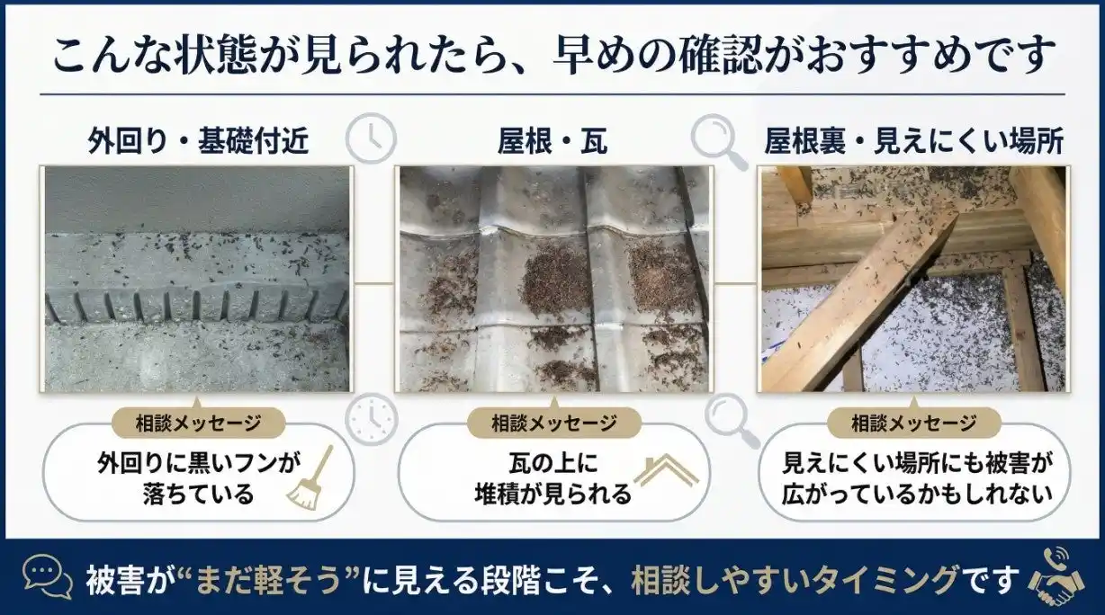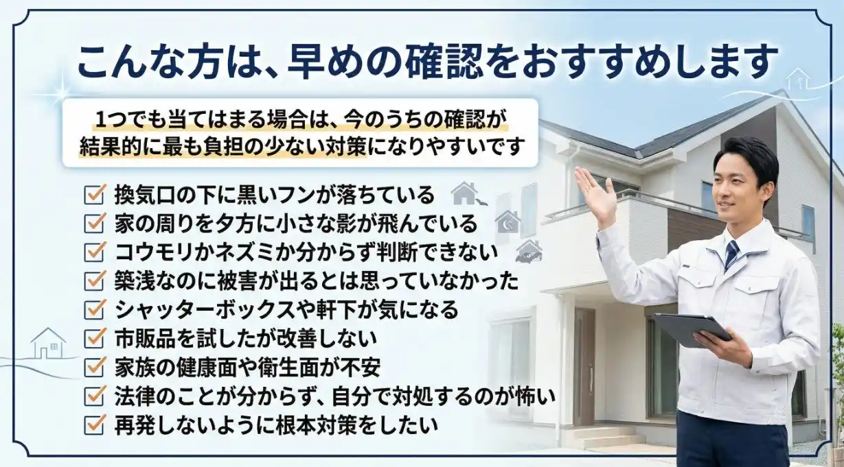 | 1つでも当てはまる場合は、今のうちの確認が結果的に最も負担の少ない対策になりやすいです。 | ||||||||||
