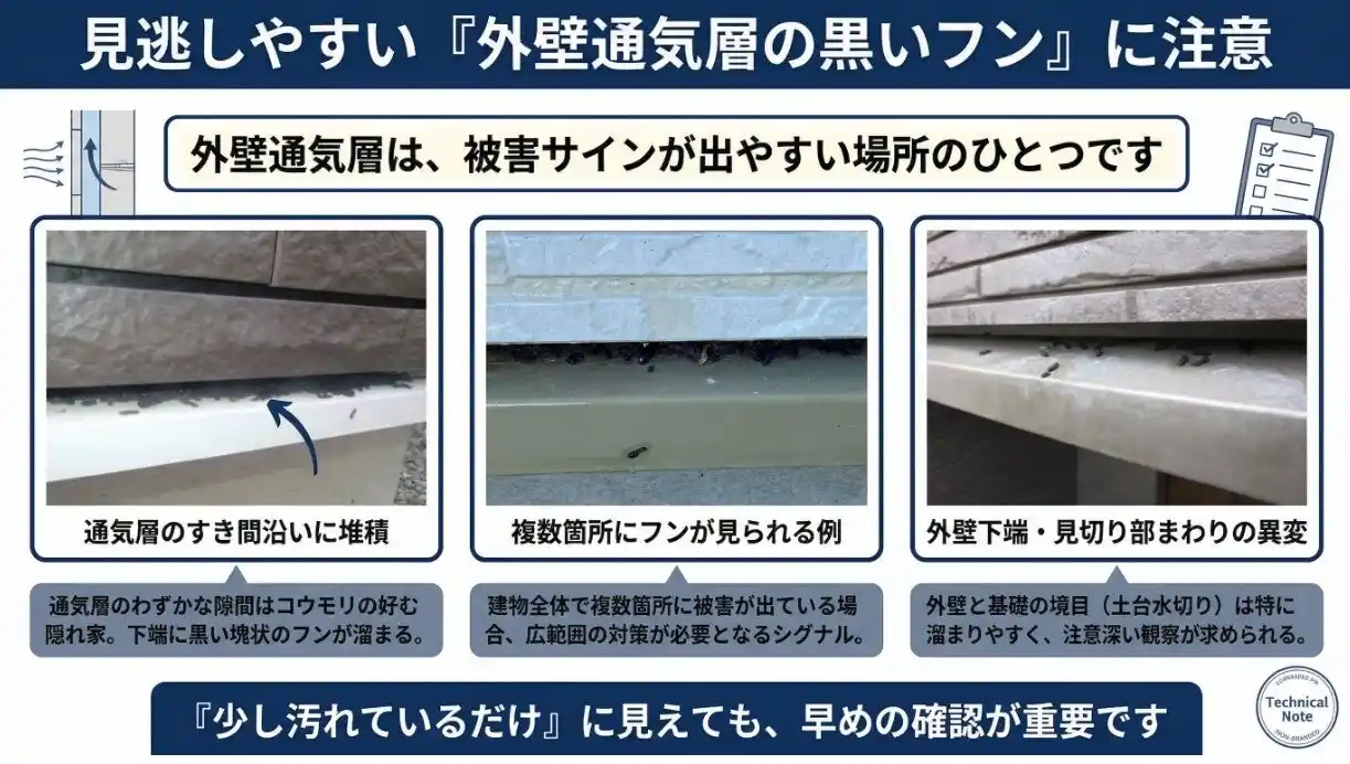 | 背景にあるのは、外壁の通気層(一般的に約15mm)、換気フード、軒先、シャッターボックス、瓦の取り合いなど、見落とされやすい“わずかな隙間”です。アブラコウモリは市街地周辺でも比較的身近に見られる種で、家屋内に入り込んで衛生面の問題を起こすことがあります。福岡県の公開情報でも、6~7月が出産シーズンとされています。 | ||||||||||