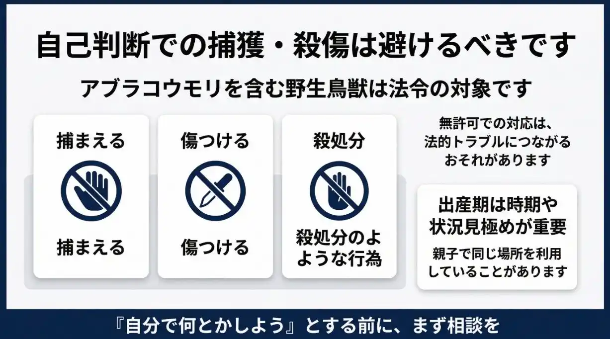 | アブラコウモリを含む野生鳥獣は、鳥獣保護管理法の対象です。環境省は、狩猟による場合などを除き、鳥獣の捕獲・殺傷等は原則禁止であり、必要に応じて環境大臣または都道府県知事の許可を受けて行う制度を案内しています。 | ||||||||||