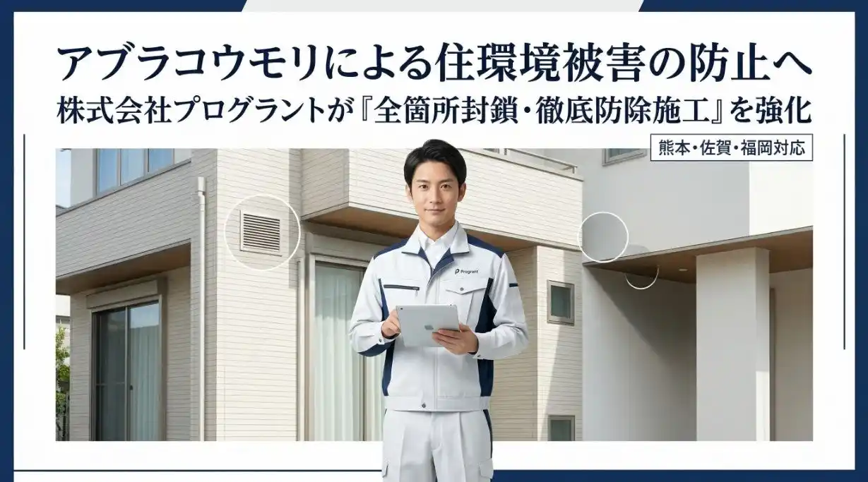 | 株式会社プログラント(本社:熊本県熊本市、代表取締役:藤井靖光)は、アブラコウモリ(いわゆる家コウモリ)による糞害・悪臭・住環境悪化・再侵入被害の防止に向け、熊本県・佐賀県・福岡県の戸建て住宅を対象とした「全箇所封鎖・徹底防除施工」を強化いたします。 | ||||||||||