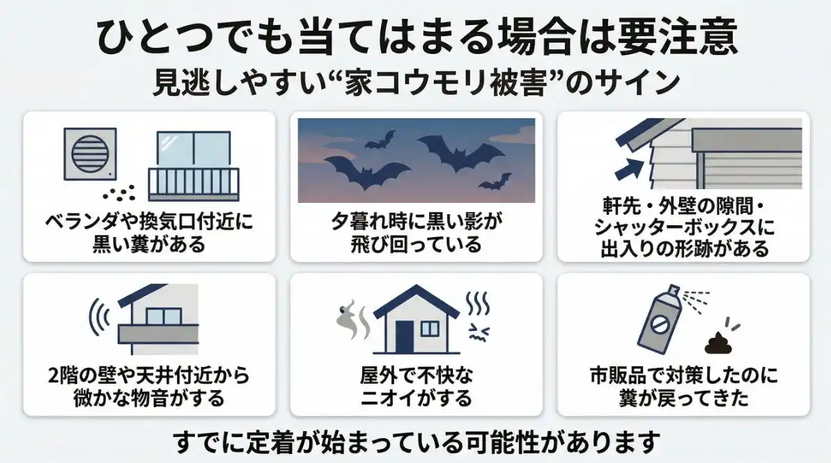| このような症状がある場合、すでにコウモリが定着し始めている可能性があります。 | ||||||||||