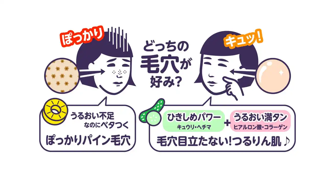 美容液をたっぷりと含んだ厚手のシートマスクを5分間つけると…キュウリエキス*1とヘチマエキス*2がベタつきをおさえて毛穴肌をキュッ!さらに保湿成分のヒアルロン酸とコラーゲンで角質層までぐんぐんうるおってしっとり。毛穴の目立たないスベスベつるりん肌へ導きます。 |