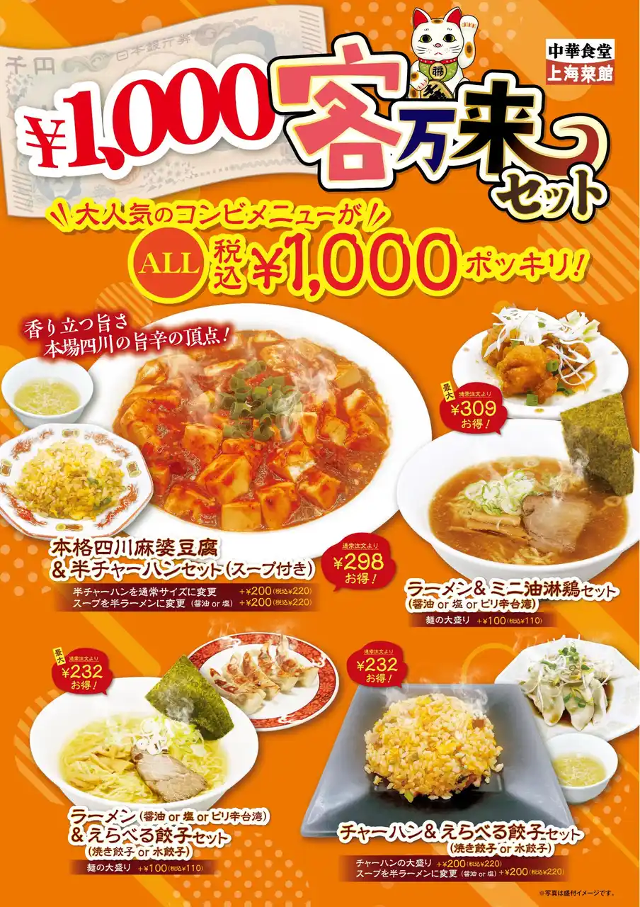 株式会社サリックストラベル(本社:埼玉県さいたま市、代表取締役社長:柳 朱理)が運営する中華料理店「中華食堂 上海菜館(アルーサ店)」は、人気メニューのセットが”いつでも1000円ポッキリ”で食べられる新たな定番商品「¥1000客万来セット」の提供を開始いたしました。 |