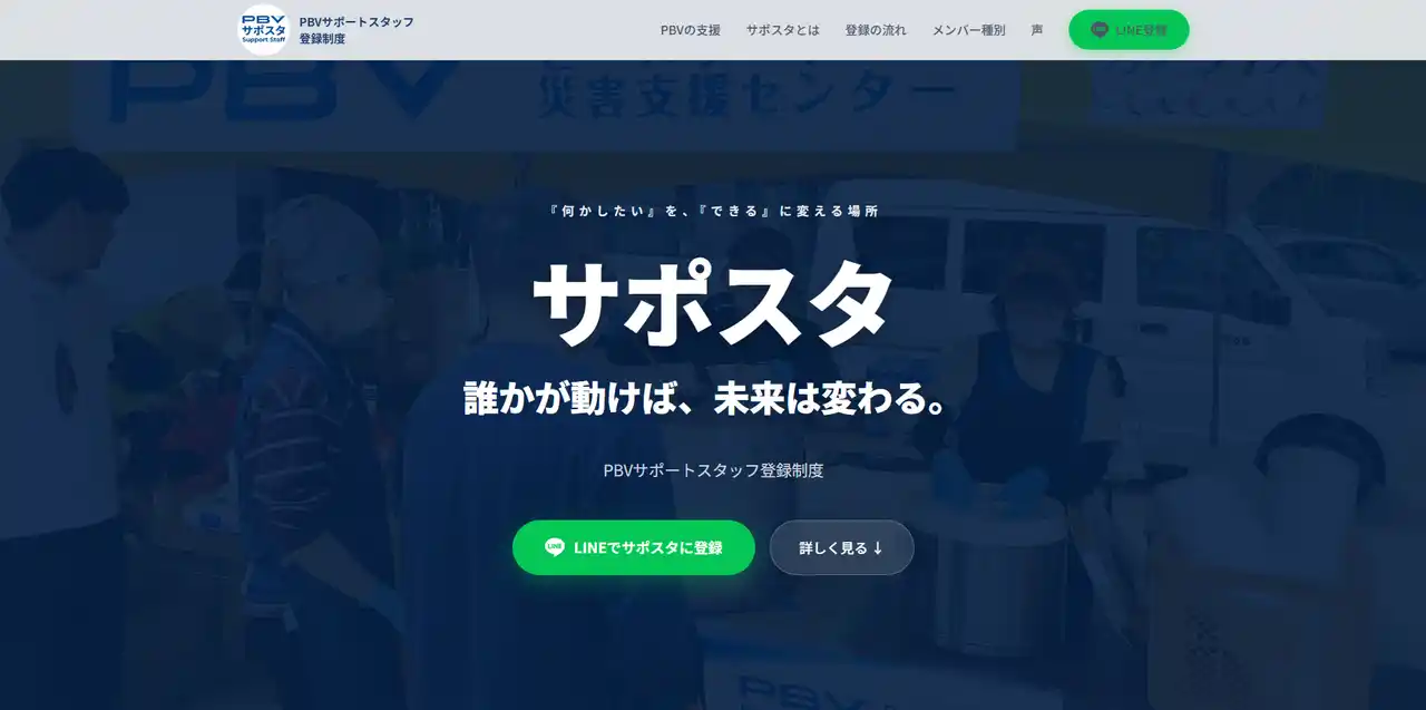 そこでPBVは、「災害支援に関する学びと実践を重ねた即応人材」を事前に育成・ネットワーク化する「PBVサポートスタッフ登録制度(通称:サポスタ)」を始動し、LINE登録者の募集を開始しました。 |