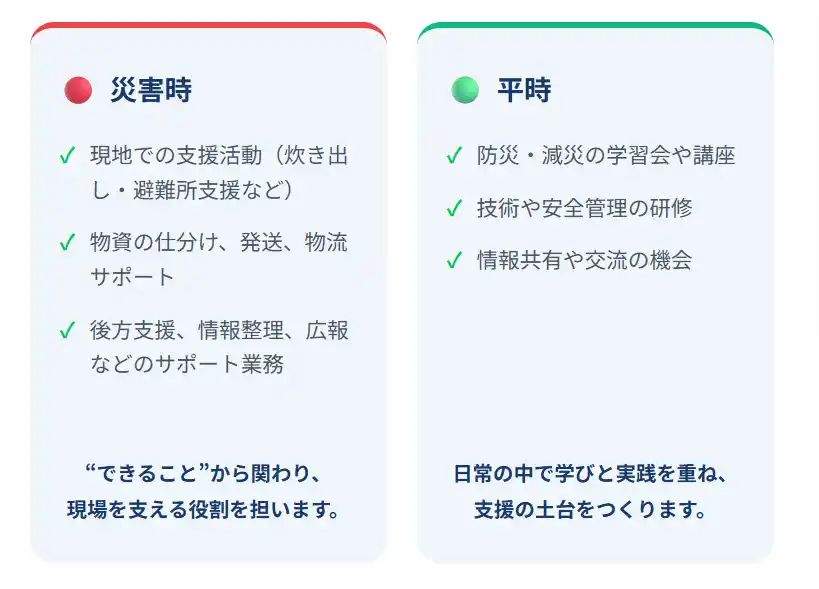 災害支援において、発災直後の数日間が非常に重要です。しかし、従来のボランティア募集は発災後に開始されるため、現場で活動をおこなうまでにはタイムラグが生じるのが課題でした。 これを事前登録制度とし、かつ平時より研修をおこなうことで、発災と同時にスキルの明確なスタッフを即座にキャスティングできる体制を構築します。支援の空白期間を最小限に抑え、一人でも多くの被災者の困りごとに迅速に応えることが可能になります。 |