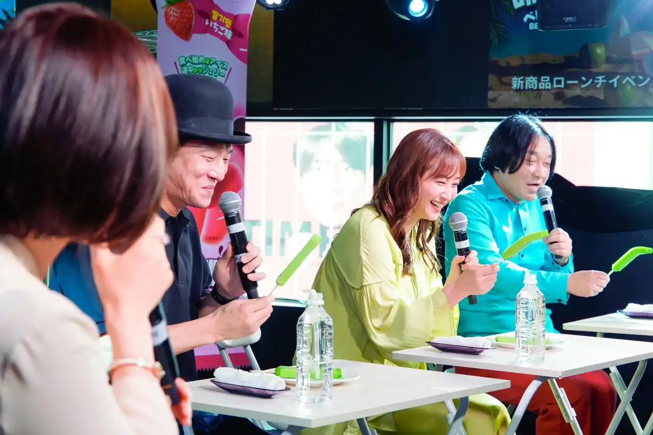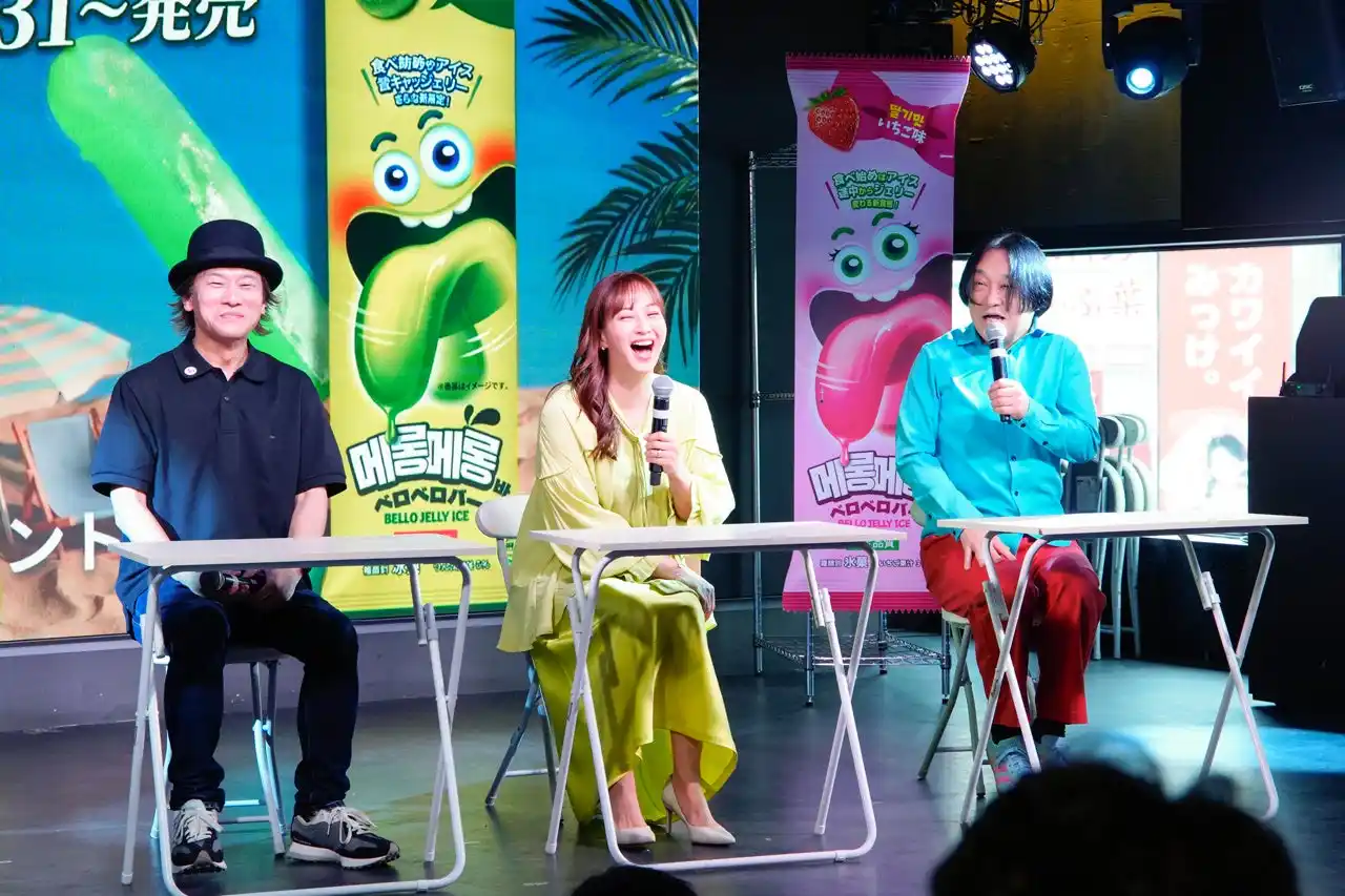 スペシャルゲストセッションでは、藤本美貴さん、永野さん、アイスマン福留さんが登壇し、「ベロベロバー」を実際に試食しながらトークを展開。凍った状態と少し溶けた状態で食感が大きく変わる点について、ゲストからは“新感覚”“体験型”“子どもにも楽しい”といった感想が寄せられました。とくに、溶けても垂れにくく、食べ進めるほどに食感の変化を楽しめる点は、会場でも大きな驚きと笑いを誘いました。 |