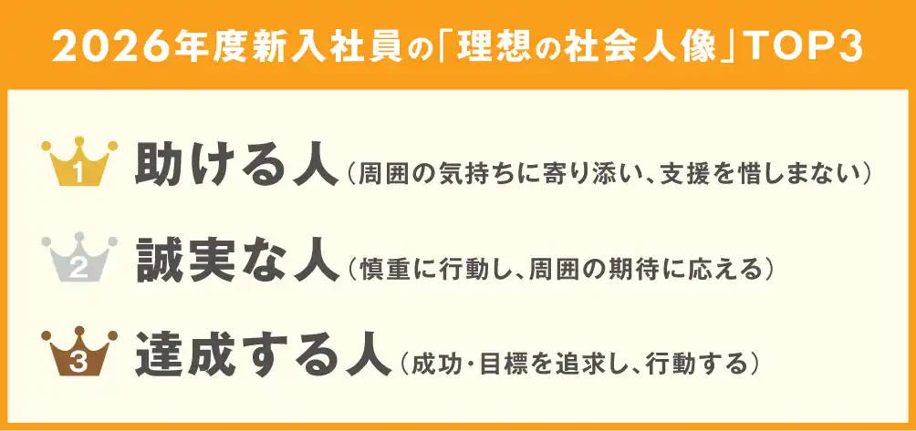 近年、企業を取り巻く環境は不確実性を増しており、新入社員には単に与えられた業務をこなすだけでなく、周囲と協力しながら役割を果たし、継続的に学び成長する姿勢が求められています。こうした中、当社が実施した調査*では、2026年入社の新入社員が描く理想の社会人像として「助ける人(周囲の気持ちに寄り添い、支援を惜しまない)」が2年連続で1位となりました(下図)。若手層の間で、個人で成果を上げること以上に、周囲と支え合いながら成長していきたいという価値観が広がっていることがうかがえます。 |