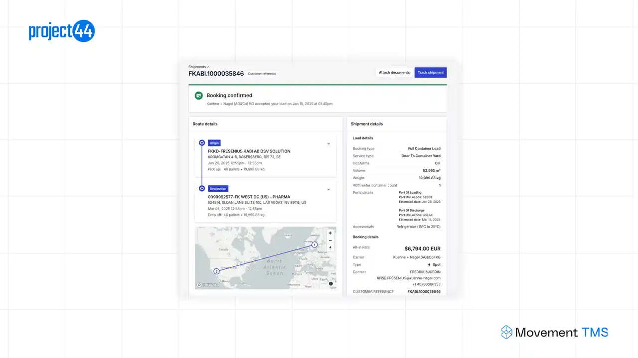 project44の可視化ソリューションを併せて利用している場合、海上輸送ブッキング機能を通じてブッキングが完了した貨物は、ブッキング番号やキャリア情報をもとに自動的に追跡対象として登録され、追加作業なしで可視化プロセスへとシームレスに移行します。ブッキング後に可視化のための手動登録は必要ありません。 |