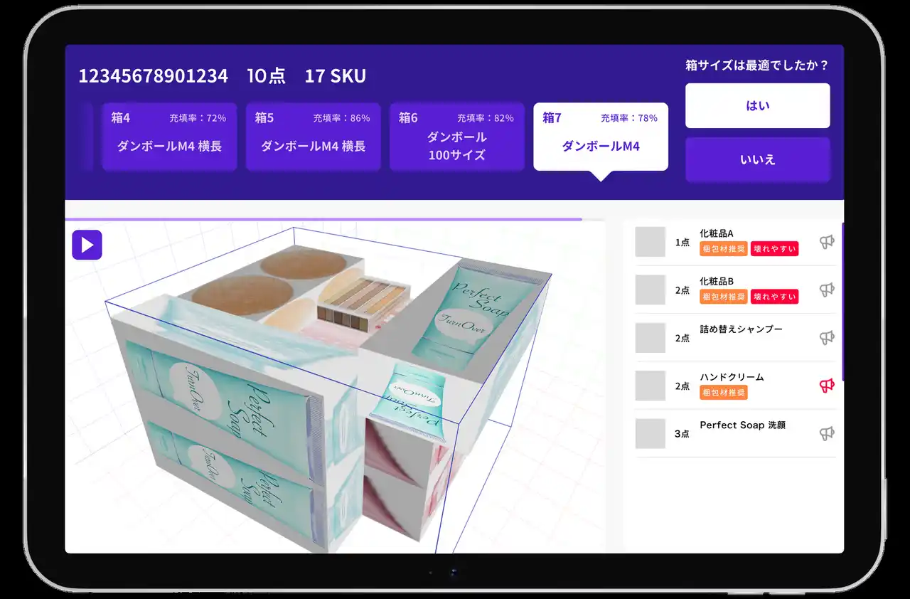 オーダーに合わせて最適な箱サイズを推奨し、商品を「どの向きで、どの順番で」入れるべきかを3Dビジュアルで視覚的に指示。熟練度に頼らない作業の標準化に貢献します。1件5円からの従量課金制で、手軽に導入いただけます。 |