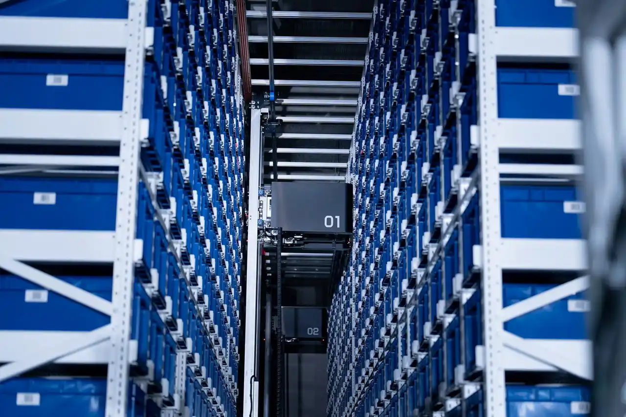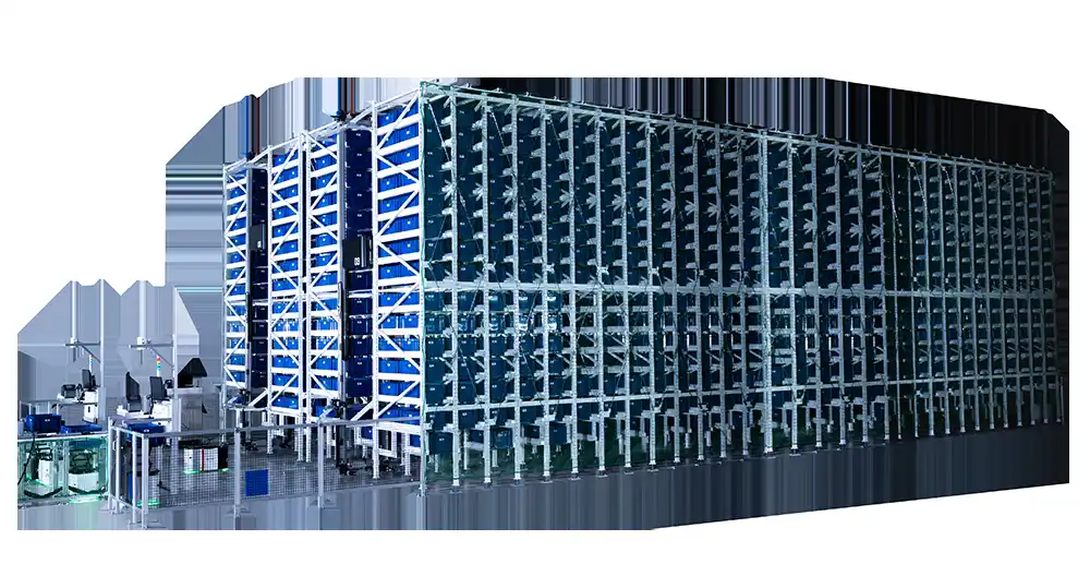 ラックに取り付けたクレーンとAGV(無人搬送車)が連携し、指定のコンテナを作業ステーションへ搬送する自動倉庫です。 |